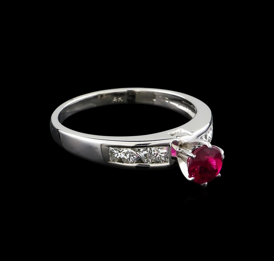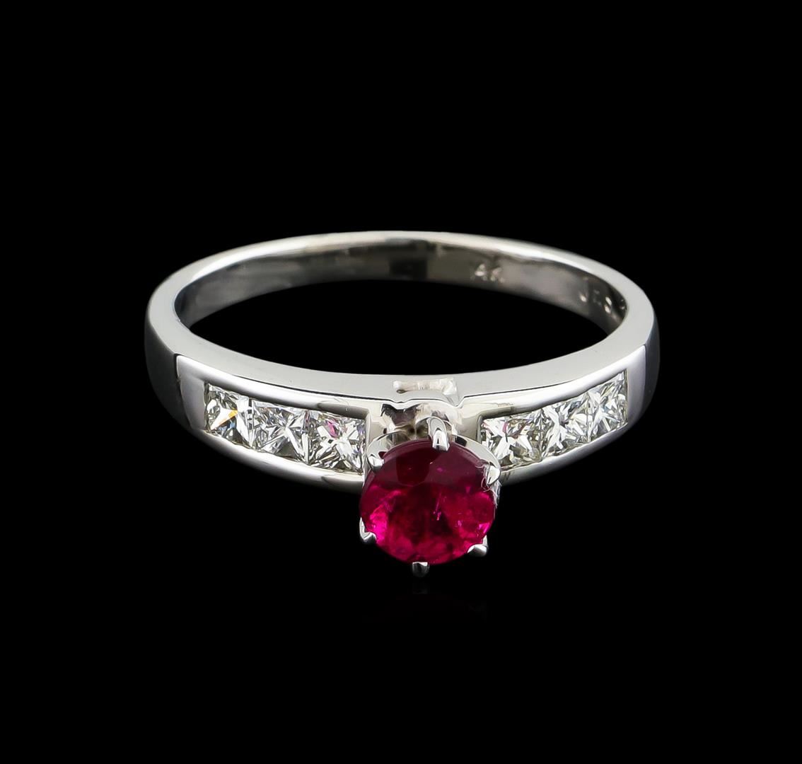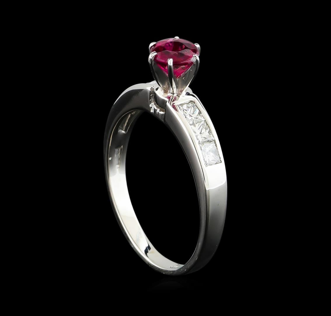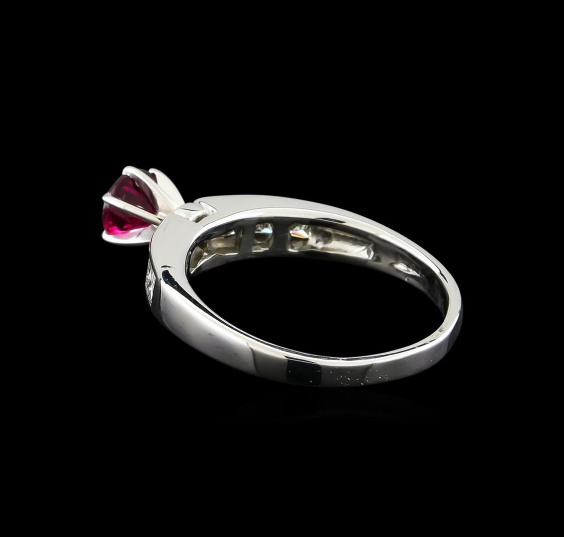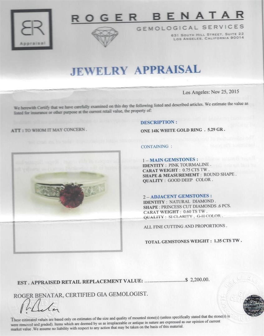 One 14KT white gold ring weighing 5.29 grams. Containing: One round shape pink tourmaline with a total weight of 0.75ct. The pink tourmaline has a clarity of good deep color. The ring also contains six princess cut natural diamonds with a total weight of 0.60ct. The diamonds have a clarity of SI and a color range of G-H. All fine cutting and proportions. RBGS Appraised.