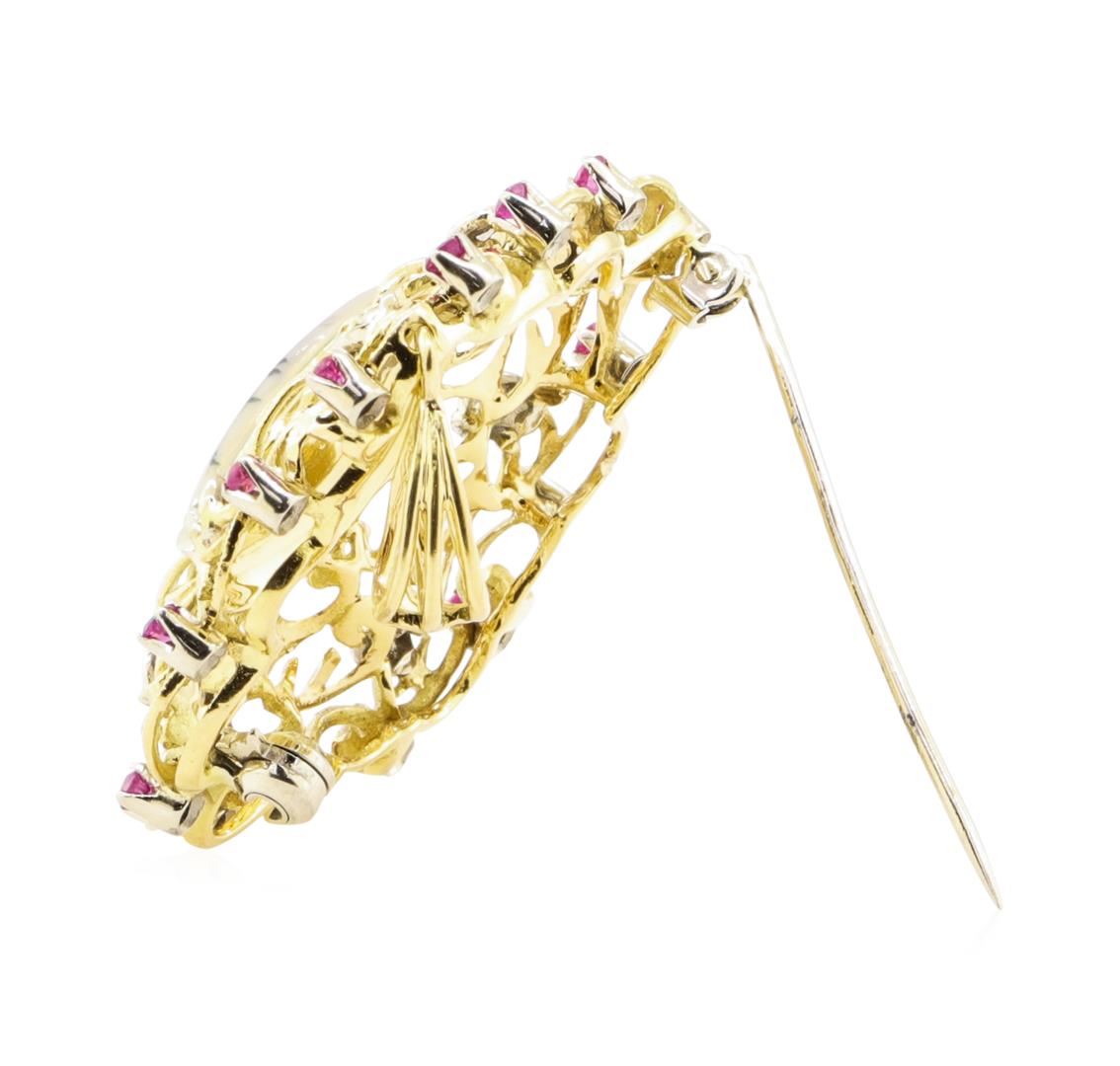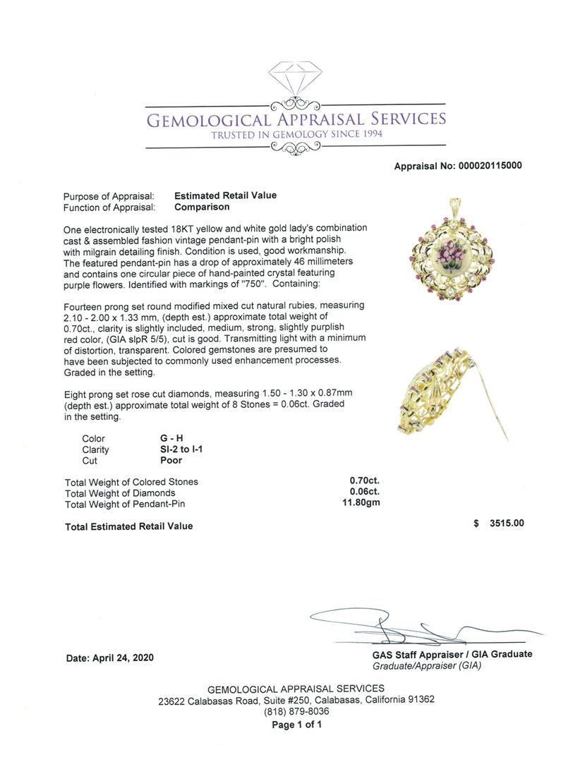 One electronically tested 18KT yellow and white gold lady's combination cast & assembled fashion vintage pendant-pin with a bright polish with milgrain detailing finish. The featured pendant-pin has a drop of approximately 46 millimeters and contains one GAS Appraised.