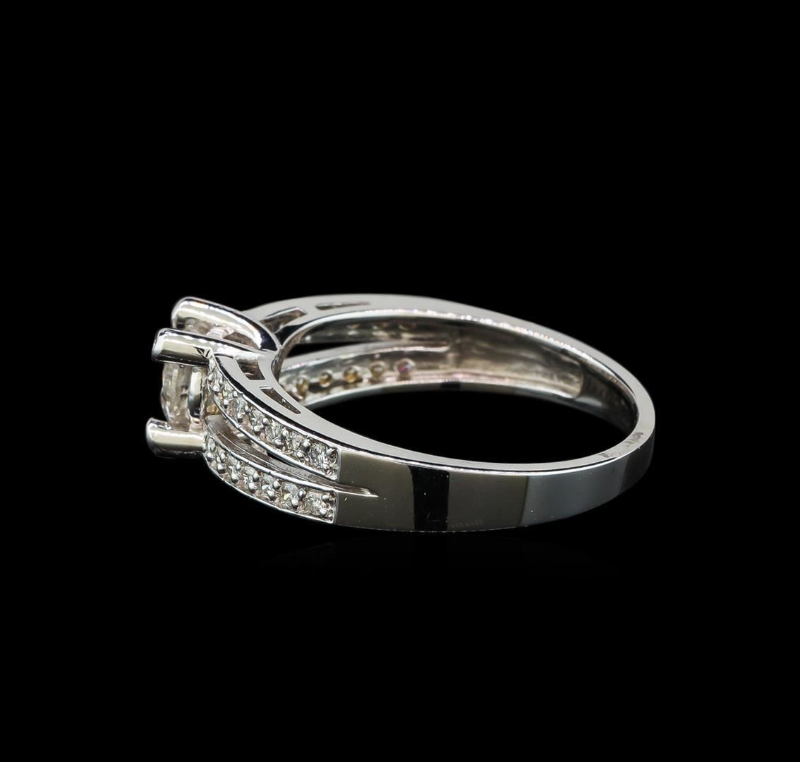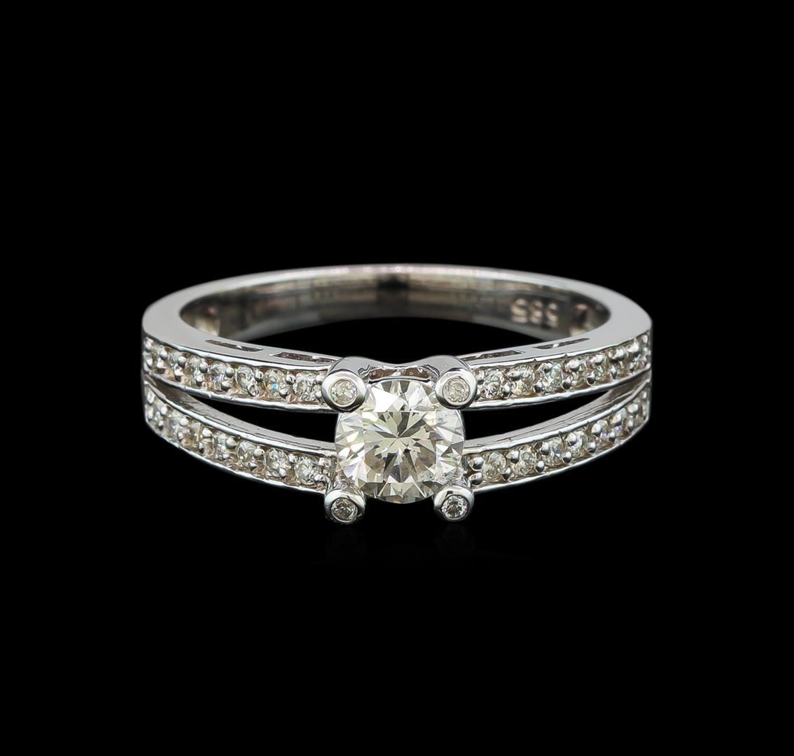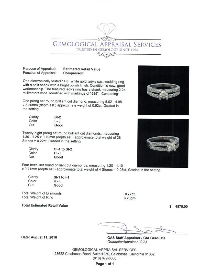One electronically tested 14KT white gold lady's cast wedding ring with a split shank with a bright polish finish. The featured lady's ring has a shank measuring 2.24 millimeters wide. Identified with markings of '585'. Condition is new, good workmanship. Containing: One prong set round brilliant cut diamond, measuring 5.02 - 4.98 x 3.20mm (depth est.) approximate weight of 0.52ct. Graded in the setting. Clarity SI-2. Color: I - J Cut Good Twenty-Eight prong set round brilliant cut diamonds, measuring 1.30 - 1.25 x 0.79mm (depth est.) approximate total weight of 28 Stones = 0.22ct. Graded in the setting. Clarity SI-1 to SI-2. Color: H - I Cut Good Four bezel set round brilliant cut diamonds, measuring 1.20 - 1.10 x 0.71mm (depth est.) approximate total weight of 4 Stones = 0.03ct. Graded in the setting. Clarity SI-1 to I-1. Color: H - I Cut Good. Total Weight of Diamonds 0.77ct.. Total Weight of Ring 3.20gm. GAS Appraised.