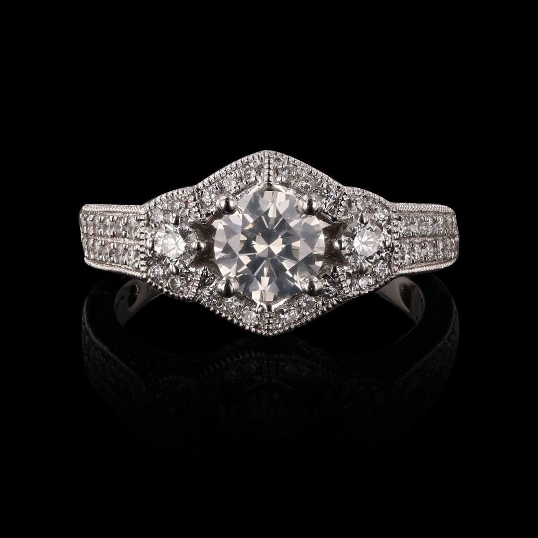 One electronically tested platinum ladies cast diamond unity ring. Condition is new, good workmanship. The featured diamond is accented by a single diamond on either side and set within a stylized diamond bezel supported by a diamond set under gallery and diamond set shoulders, completed by a two millimeter wide band. Bright polish finish with milgrain detailing throughout. Trademark is Orianne. Identified with markings of "PT950". Containing: One prong set round brilliant cut diamond, measuring 5.91 - 5.89 x 3.61mm exact weight 0.77ct with a faint fluorescence. EGL Hearts & Arrows Diamond Report attached. Graded loose prior to setting in the EGL Laboratory Report #US 917731005D. Clarity SI-2 Color H Depth 61.2% Table 59.0% Pavil. Depth% 43.9% Polish Excellent Symmetry Very Good One hundred thirty-four prong set round brilliant cut diamonds approximate total weight of 134 Stones = 0.85ctw. Graded in the setting. Clarity VS-1 to VS-2 Color D - F Total Weight of Diamonds 1.62ctw. Total Weight of Ring 6.26 gm Size: 7