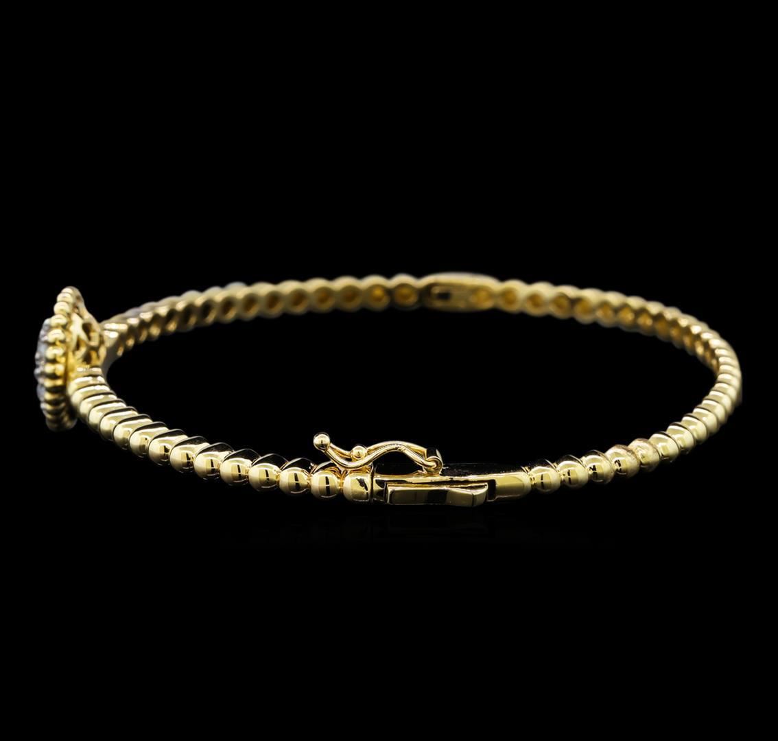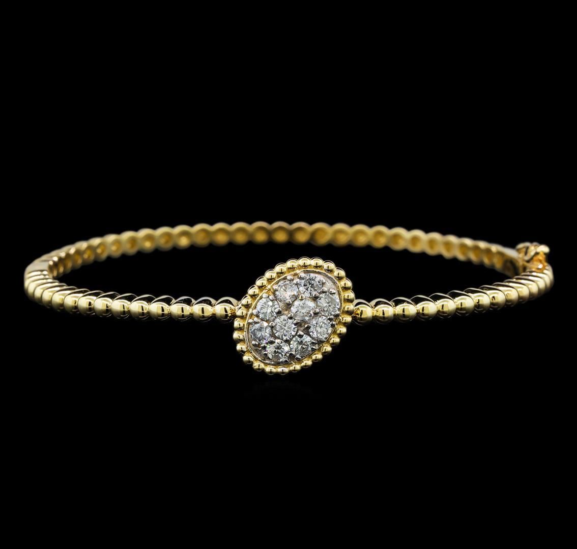 One electronically tested 14KT yellow gold lady's combination cast & assembled fashion bangle bracelet with a tongue clasp with foldover safety with a bright polish finish. The featured lady's bangle bracelet has a straight line scalloped motif and measures approximately 7 inches in length. Identified with markings of 'K14'. Condition is new, good workmanship. Containing: Ten prong set round brilliant cut diamonds, measuring 2.80 - 2.70 x 1.71mm (depth est.) approximate total weight of 10 Stones = 0.78ct. Graded in the setting. Clarity SI-1 to I-1. Color: H - I Cut Good. Total Weight of Diamonds 0.78ct.. Total Weight of Bangle Bracelet 13.30gm. GAS Appraised.