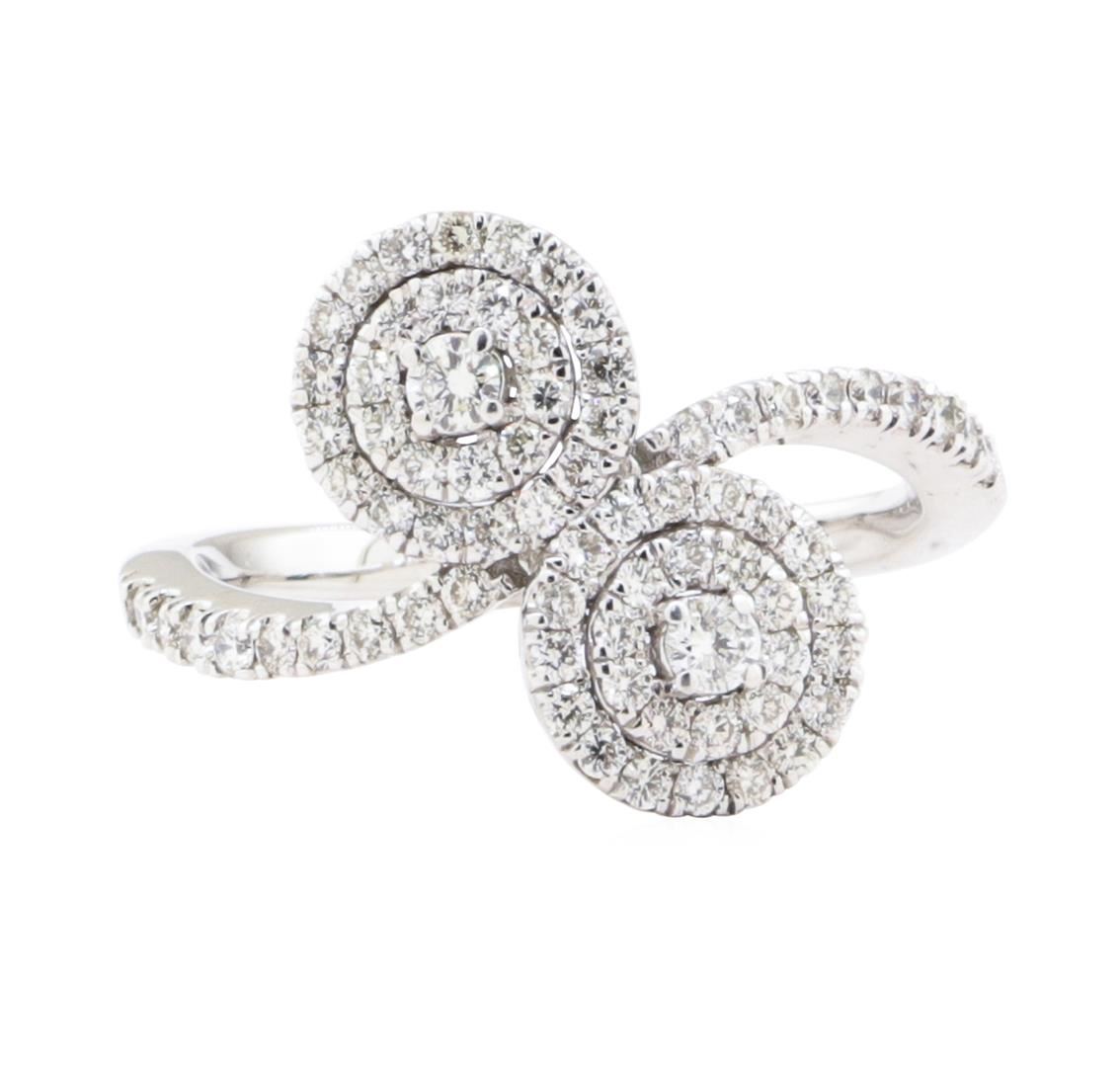One electronically tested 14KT white gold lady's cast fashion swirl ring with a two conected swirls with a bright polish finish. The featured lady's ring has a shank measuring 1.90 millimeters in width. Identified with markings of '14K'. Condition is new, good workmanship. Containing: Two prong set round brilliant cut diamonds, measuring 2.40 - 2.35 x 1.43mm (depth est.) approximate total weight of 2 Stones = 0.10ct. Graded in the setting. Color H - I Clarity SI-1 to SI-2 Cut Very Good Seventy-Four prong set round brilliant cut diamonds, measuring 1.40 - 1.30 x 0.84mm (depth est.) approximate total weight of 74 Stones = 0.68ct. Graded in the setting. Color H - I Clarity VS-2 to SI-1 Cut Very Good. Total Weight of Diamonds 0.78ct.. Total Weight of Ring 3.20gm GAS Appraised at $3590.00. GAS Appraised.