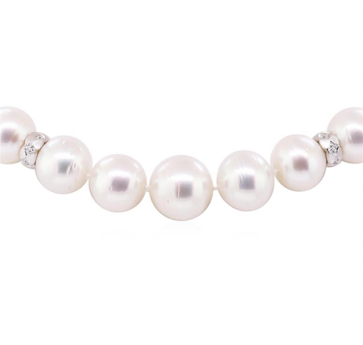 One graduated single strand pearl necklace 18.0' princess length, knotted with a tongue clasp & foldover safety containing 37 south sea cultured pearls, 11.1mm to 14.6mm in size. The pearls are white in color with a good luster, off round, and lightly blemished with very good matching. The featured pearl necklace has a 14KT white gold vintage bow motif clasp and rondels. Graded on the strand.South Sea cultured pearls are farmed in the oceans surrounding Australia, Indonesia, the Philippines and the southern coast of China. The main source of Australian South Sea pearls lies in the northwest on the Kimberly coast. South Sea cultured pearls are formed in the Pinctada Maxima oyster. These pearls take between two to three years to grow and have a unique nacre due to the fast moving and clean waters of the South Seas. Eight bezel set round brilliant cut diamonds, measuring 1.80 - 1.75 x 1.10mm (depth est.) approximate total weight of 8 Stones = 0.18ct. Graded in the setting. Color H - I Clarity VS-2 to SI-1 Cut Very Good Ninety prong set single cut diamonds, measuring 1.25 - 1.15 x 0.74mm (depth est.) approximate total weight of 90 Stones = 0.60 ct. Graded in the setting. Color H - I Clarity VS-2 to SI-1 Cut Good. Total Weight of Diamonds 0.78ct.. Total Weight of 103.20gm GAS Appraised at $21000.00. GAS Appraised.