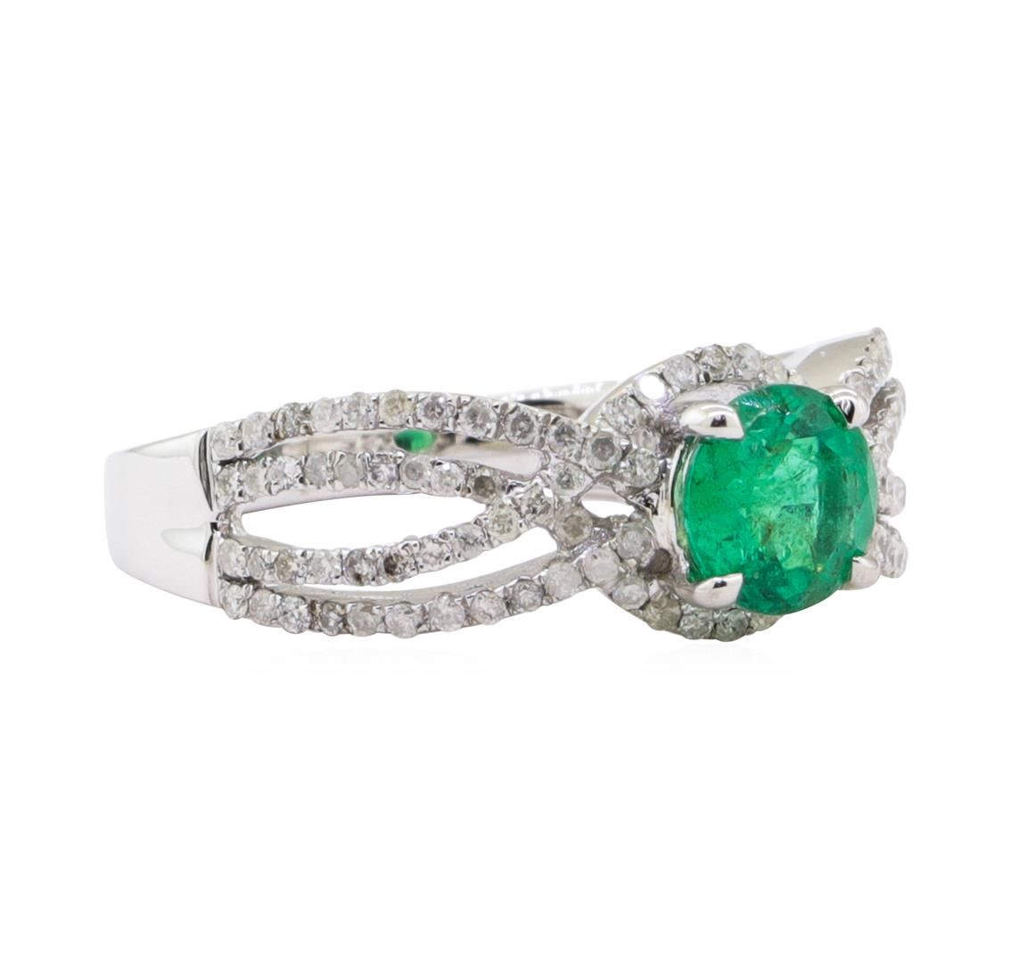 One electronically tested 14KT white gold ladies cast & assembled emerald & diamond ring. The ring features an emerald set within a diamond bezel, supported by four diamond ribbons at the shoulders, completed by a two millimeter wide band. Bright polish finish. Trademark is Orianne. Identified with markings of "14K". Condition is new, good workmanship. Containing: One prong set round mixed cut natural emerald, measuring 6.00 - 6.00 x 3.70 mm, exact weight 0.78ct., clarity is moderately included, type III, medium, very slightly grayish, green color, (GIA G 5/3), cut is good. Transmitting light somewhat diffusely, transparent to translucent. Naturally occurring internal & external characteristics are present. Indications of oil residue. Graded in the setting. One Hundred Four prong set round brilliant cut diamonds exact total weight 104 Stones = 0.44ct. The color grade reflects the overall average for the group. Graded in the setting. Clarity I-1 to I-3 Color F - H Total Weight of Colored Stones0.78 ct. Total Weight of Diamonds 0.44 ct. Total Weight of Ring 4.00 gm Estimated Retail Value $ 4,650.00 US