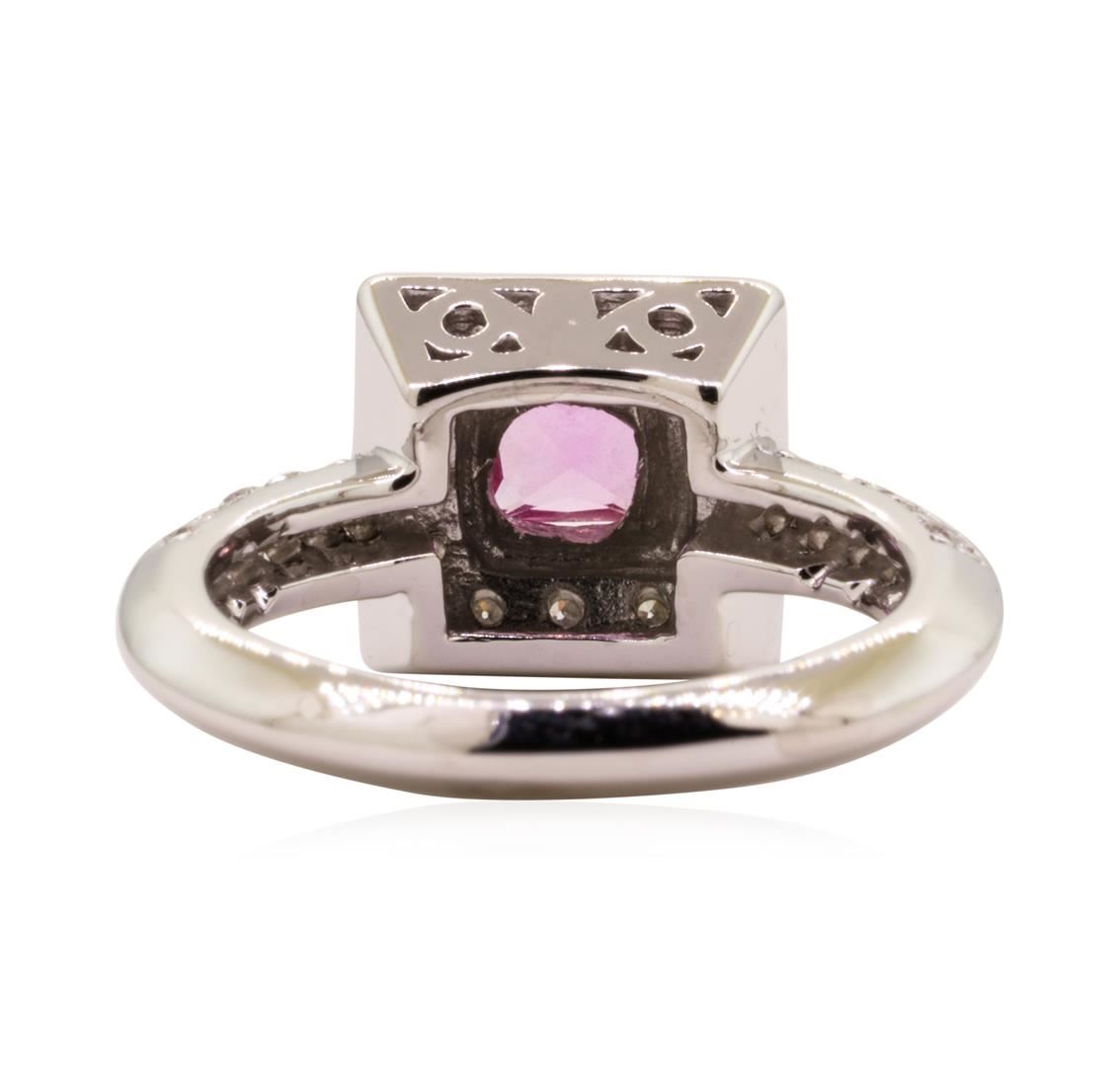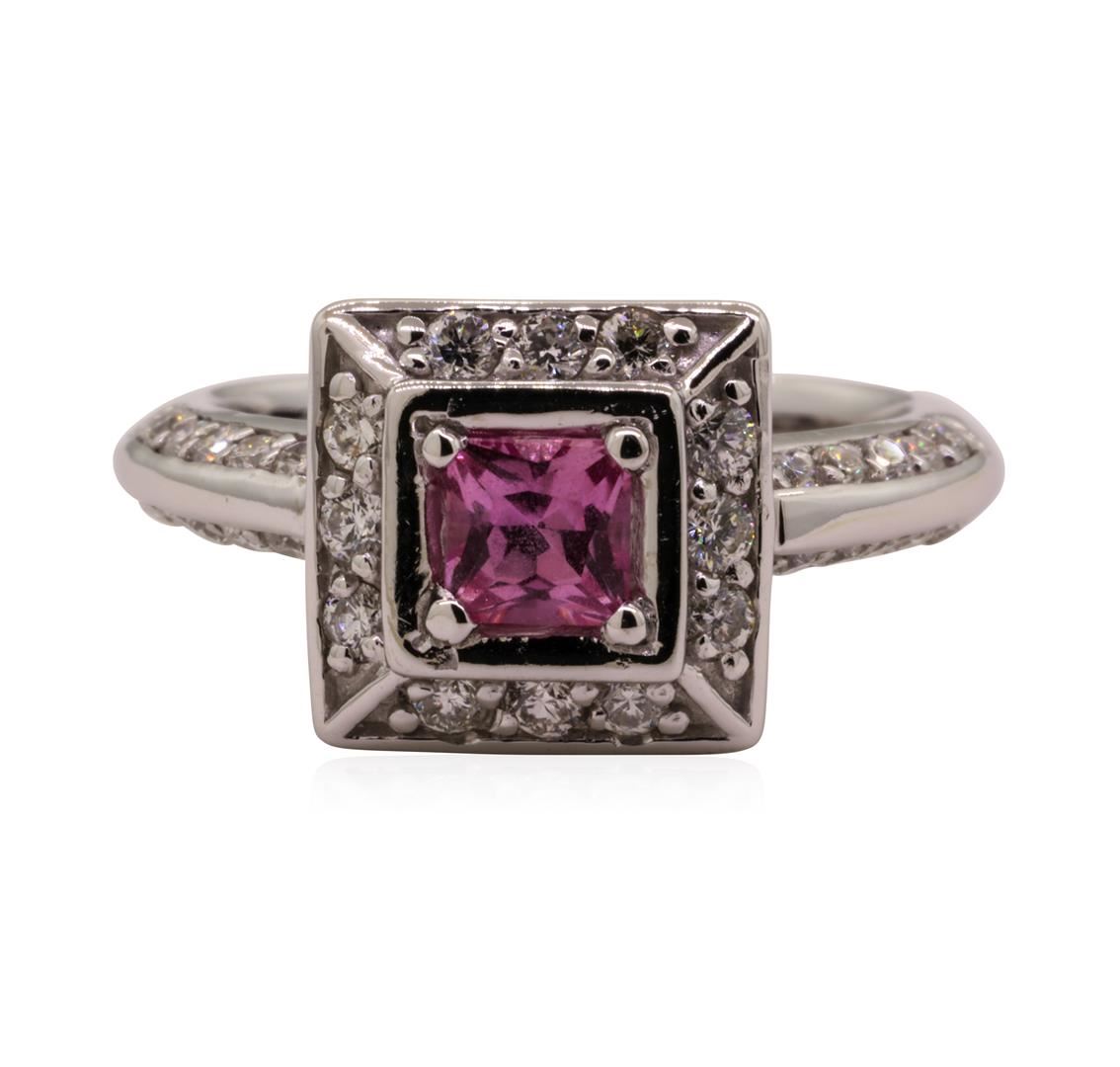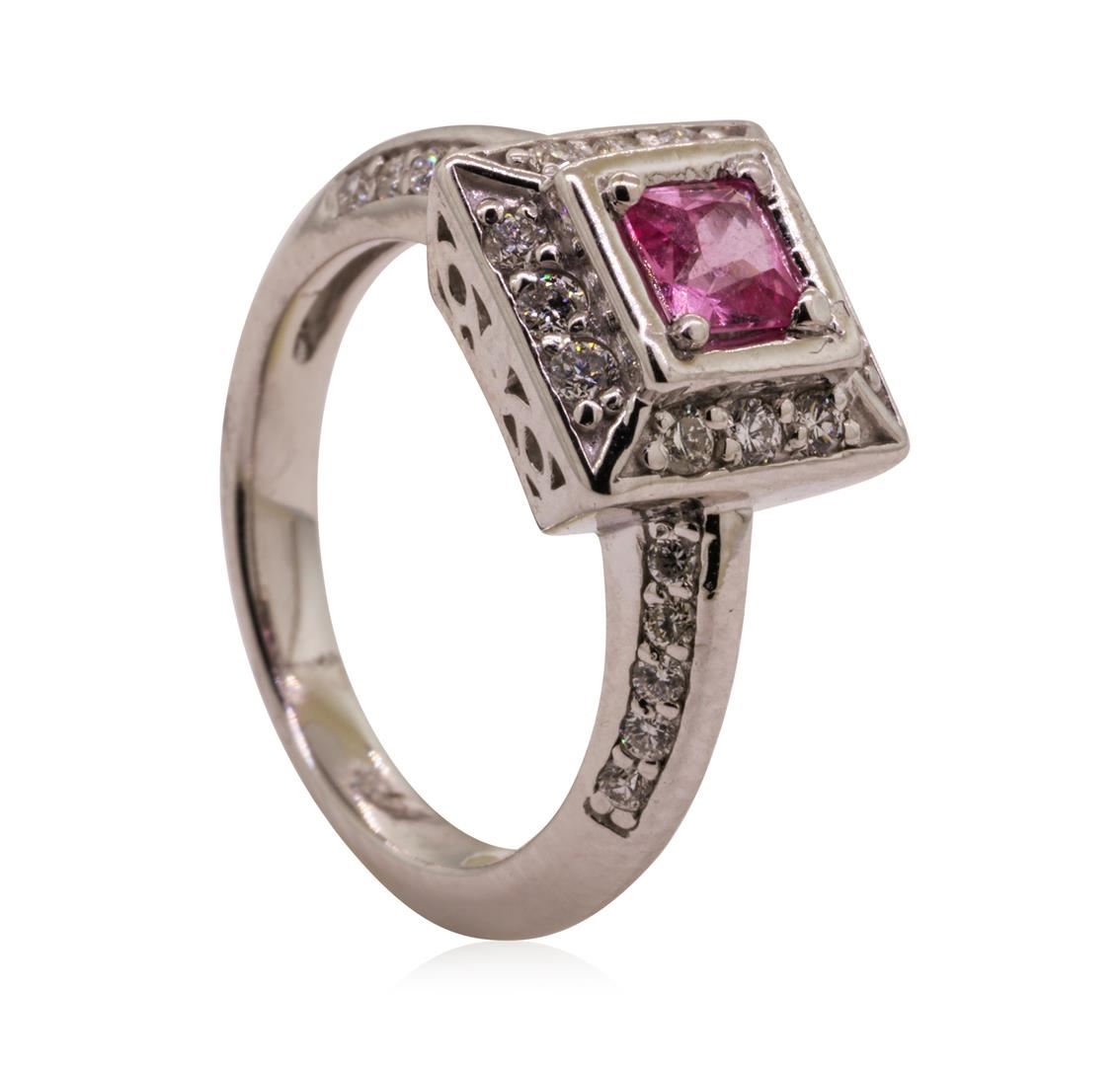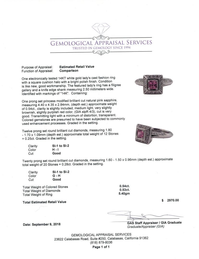 One electronically tested 14KT white gold lady's cast fashion ring with a square cushion halo with a bright polish finish. The featured lady's ring has a filigree gallery and a knife edge shank measuring 2.50 millimeters wide. Identified with markings of '14K'. Condition is like new, good workmanship. Containing: One prong set princess modified brilliant cut natural pink sapphire, measuring 4.40 x 4.35 x 2.84mm, (depth est.) approximate weight of 0.54ct., clarity is slightly included, medium light, very slightly brownish, slightly purplish red color, (GIA slpR 4/3), cut is very good. Transmitting light with a minimum of distortion, transparent. Colored gemstones are presumed to have been subjected to commonly used enhancement processes. Graded in the setting. Twelve prong set round brilliant cut diamonds, measuring 1.80 - 1.70 x 1.09mm (depth est.) approximate total weight of 12 Stones = 0.25ct. Graded in the setting. Color H - I Clarity SI-1 to SI-2 Cut Good Twenty prong set round brilliant cut diamonds, measuring 1.60 - 1.50 x 0.96mm (depth est.) approximate total weight of 20 Stones = 0.28ct. Graded in the setting. Color G - H Clarity SI-1 to SI-2 Cut Good. Total Weight of Colored Stones 0.54ct.. Total Weight of Diamonds 0.53ct.. Total Weight of Ring 5.40gm GAS Appraised at $2970.00. GAS Appraised.