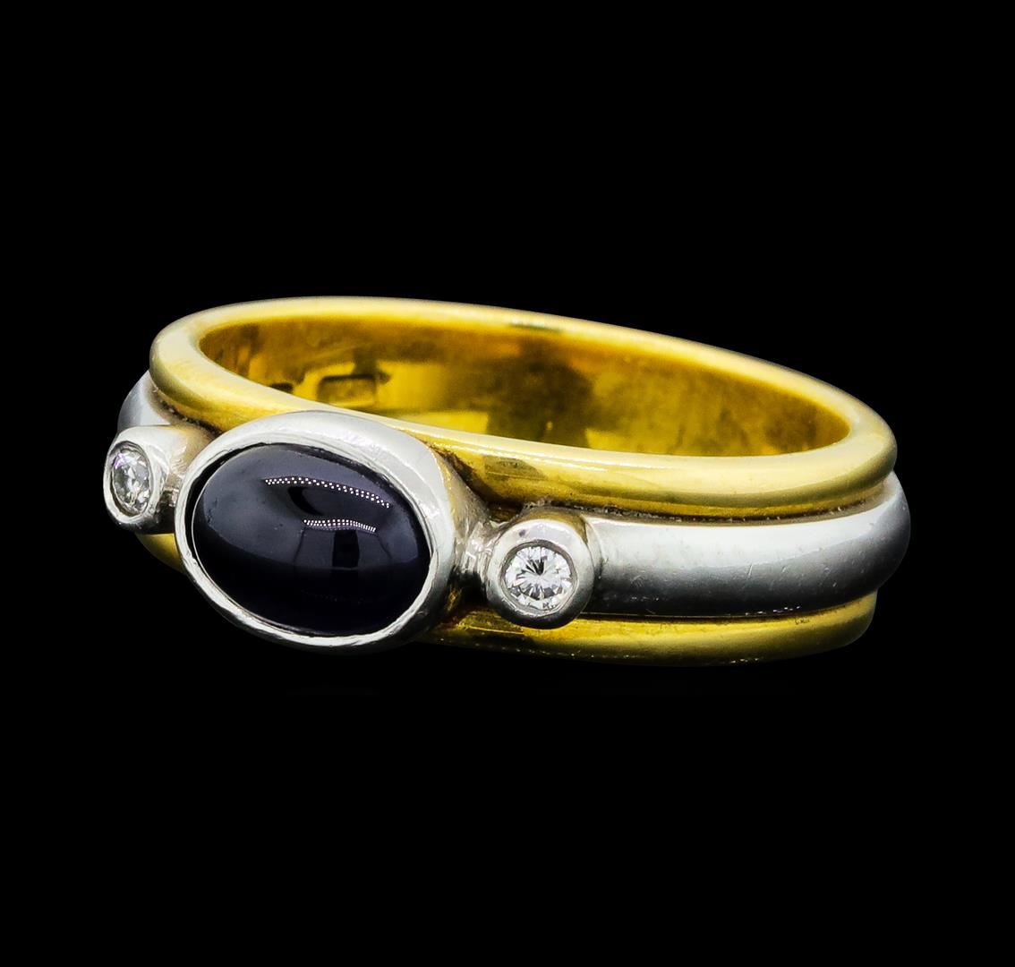 One lady's ring featuring: 18KT yellow gold and platinum weighing 9.4 grams containing one blue sapphire weighing 0.80ct and diamonds weighing 0.04ctw.