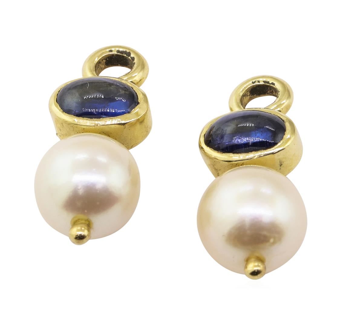 One pair of earring enhancers measuring 17 millimeters in length featuring: 14KT yellow gold weighing 2.4 grams containing two oval cabochon blue sapphires weighing 0.80ctw and two pearls measuring 7.3 millimeters in diameter.