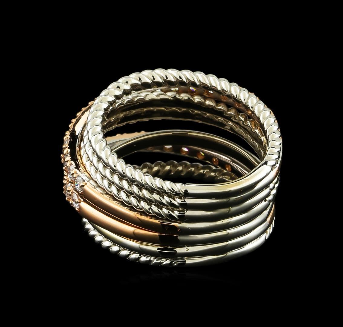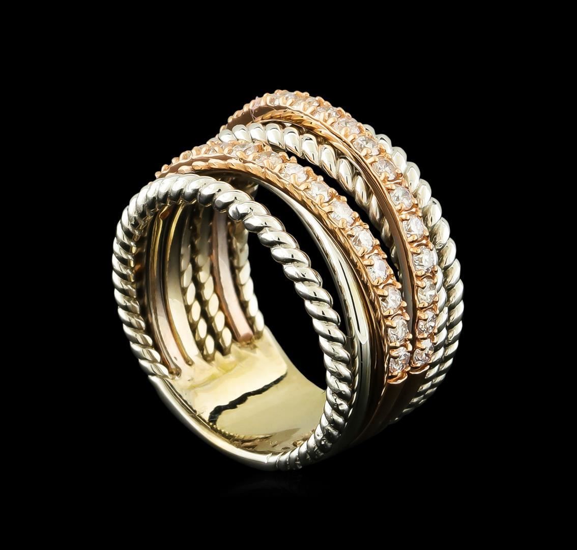 One electronically tested 14KT rose and white gold lady's cast fashion ring with a wide crossover band with a bright polish finish. The featured lady's ring has a shank measuring 9.79 millimeters wide. Identified with markings of "K14". Condition is new, good workmanship. Containing: Thirty-Two prong set round brilliant cut diamonds, measuring 1.90 - 1.85 x 1.17mm (depth est.) approximate total weight of 32 Stones = 0.80ct. Graded in the setting. Clarity: VS-2 to SI-1. Color: H - I. Cut Very Good. Total Weight of Diamonds 0.80ct. Total Weight of Ring 10.20gm. GAS Appraised.