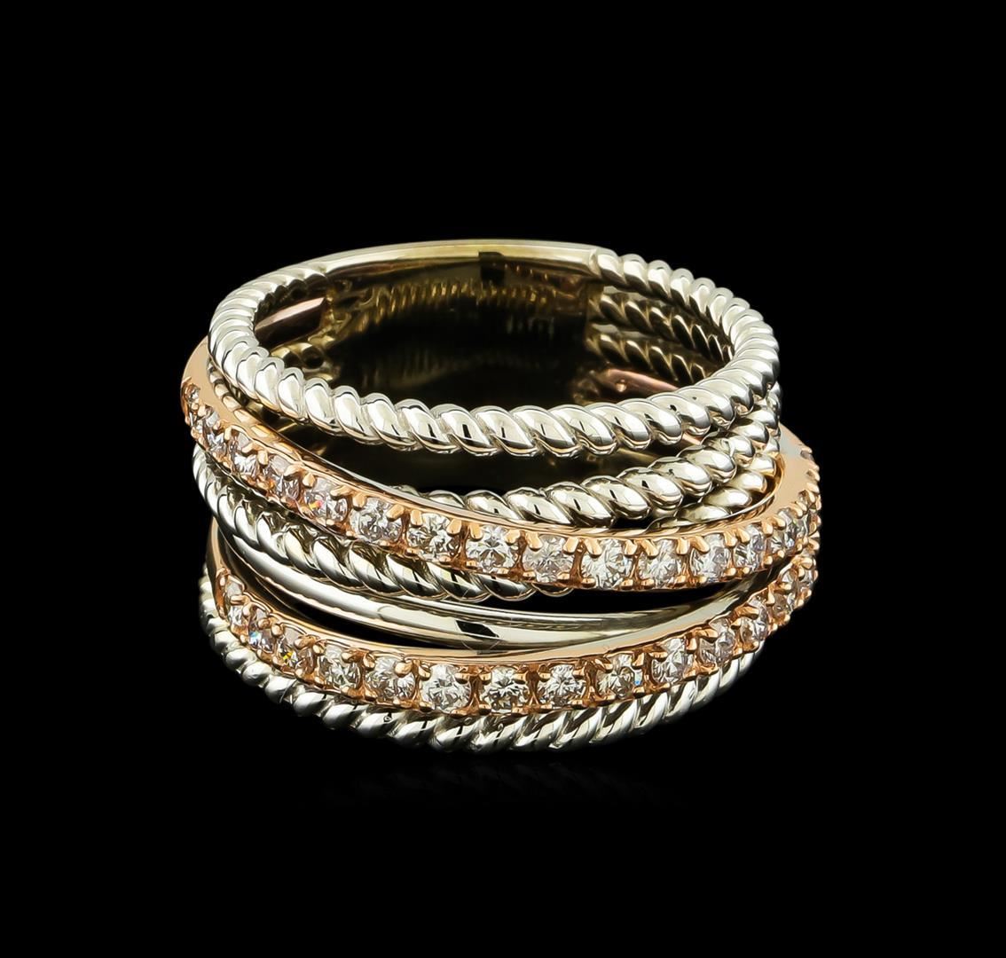 One electronically tested 14KT rose and white gold lady's cast fashion ring with a wide crossover band with a bright polish finish. The featured lady's ring has a shank measuring 9.79 millimeters wide. Identified with markings of "K14". Condition is new, good workmanship. Containing: Thirty-Two prong set round brilliant cut diamonds, measuring 1.90 - 1.85 x 1.17mm (depth est.) approximate total weight of 32 Stones = 0.80 ct. Graded in the setting. Clarity: VS-2 to SI-1. Color: H - I. Cut Very Good. Total Weight of Diamonds 0.80 ct. Total Weight of Ring 10.20gm. GAS Appraised.