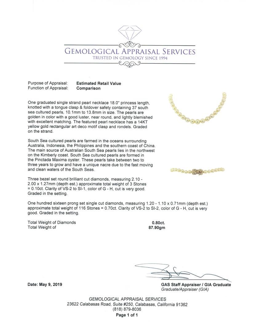 One graduated single strand pearl necklace 18.0' princess length, knotted with a tongue clasp & foldover safety containing 37 south sea cultured pearls, 10.1mm to 13.8mm in size. The pearls are golden in color with a good luster, near round, and lightly blemished with excellent matching. The featured pearl necklace has a 14KT yellow gold rectangular art deco motif clasp and rondels. Graded on the strand.South Sea cultured pearls are farmed in the oceans surrounding Australia, Indonesia, the Philippines and the southern coast of China. The main source of Australian South Sea pearls lies in the northwest on the Kimberly coast. South Sea cultured pearls are formed in the Pinctada Maxima oyster. These pearls take between two to three years to grow and have a unique nacre due to the fast moving and clean waters of the South Seas. Three bezel set round brilliant cut diamonds, measuring 2.10 - 2.00 x 1.27mm (depth est.) approximate total weight of 3 Stones = 0.10ct. Graded in the setting. Color G - H Clarity VS-2 to SI-1 Cut Very Good One Hundred Sixteen prong set single cut diamonds, measuring 1.20 - 1.10 x 0.71mm (depth est.) approximate total weight of 116 Stones = 0.70ct. Graded in the setting. Color G - H Clarity VS-2 to SI-2 Cut Very Good. Total Weight of Diamonds 0.80ct.. Total Weight of 87.90gm GAS Appraised at $21090.00. GAS Appraised.
