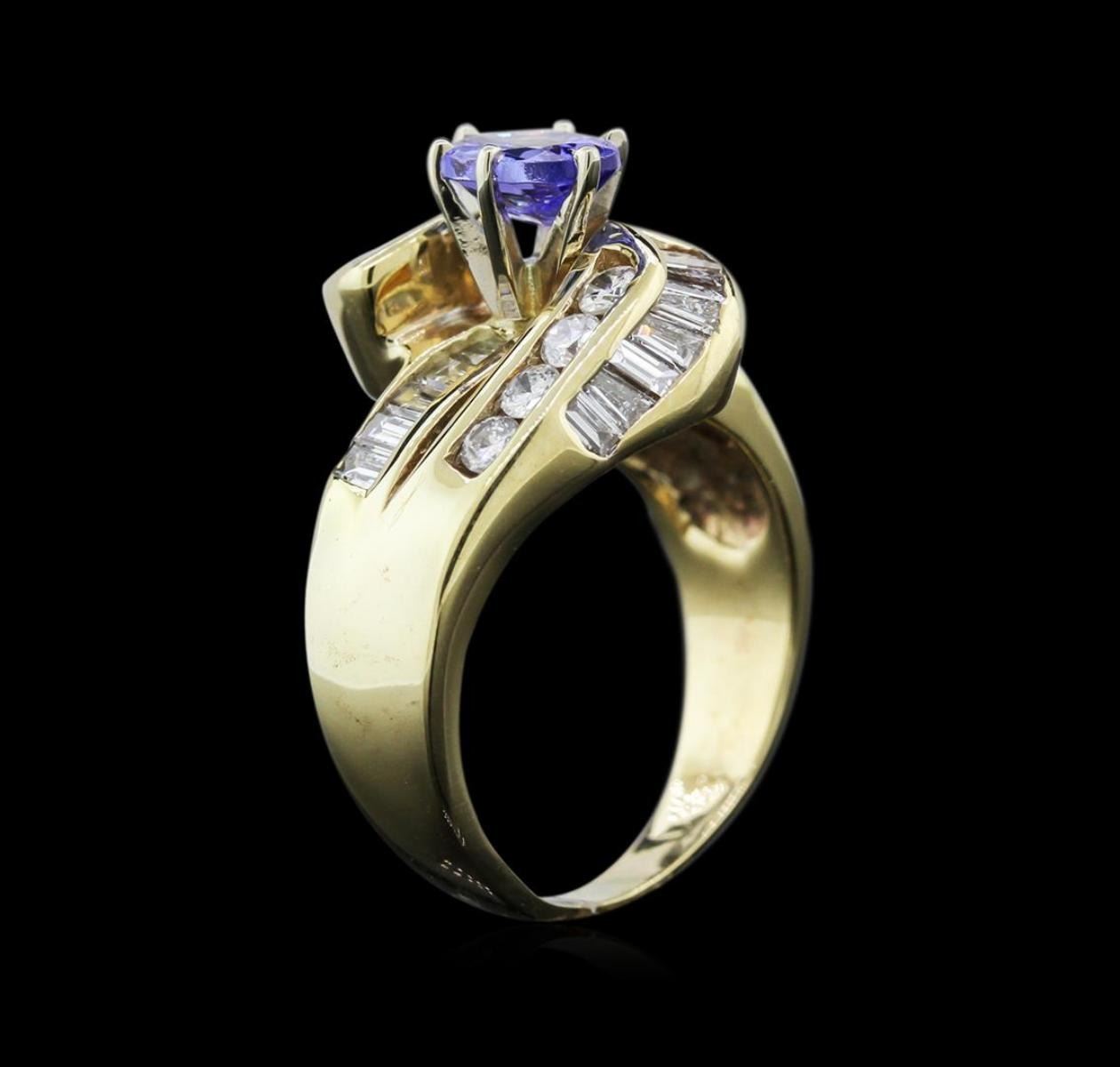 One electronically tested 14KT yellow gold ladies cast tanzanite and diamond ring with a bright polish finish. Identified with markings of "14K". Condition is new. Containing: One prong set oval modified brilliant cut natural tanzanite, measuring 7.00 x 5.00 x 3.25mm, approximate weight of 0.80ct., clarity is eye clean, type I, medium light, moderately strong, violet color, (GIA V 4/4), cut is good. Twenty-Four channel set baguette cut diamonds, measuring 2.00 x 1.56 x 1.33mm (depth est.) approximate total weight of 24 Stones = 0.88ct. Clarity: VS-2. Color: H - I, Cut is Good. Eight channel set round brilliant cut diamonds, measuring 2.50 - 2.50 x 1.50mm (depth est.) approximate total weight of 8 Stones = 0.46ct. Clarity: SI-1 to SI-2. Color: G - H, Cut is Good. Colored gemstones are presumed to have been subjected to commonly used enhancement processes. All diamonds and colored gemstones are graded in the mounting, unless otherwise stated. Total Weight of Colored Stones 0.80ct. Total Weight of Diamonds 1.33ct. Total Weight of Ring 6.90gm. GGL Appraised at $3,195.00.