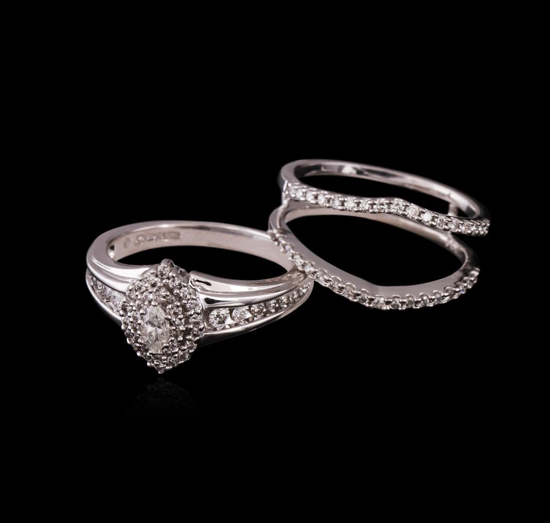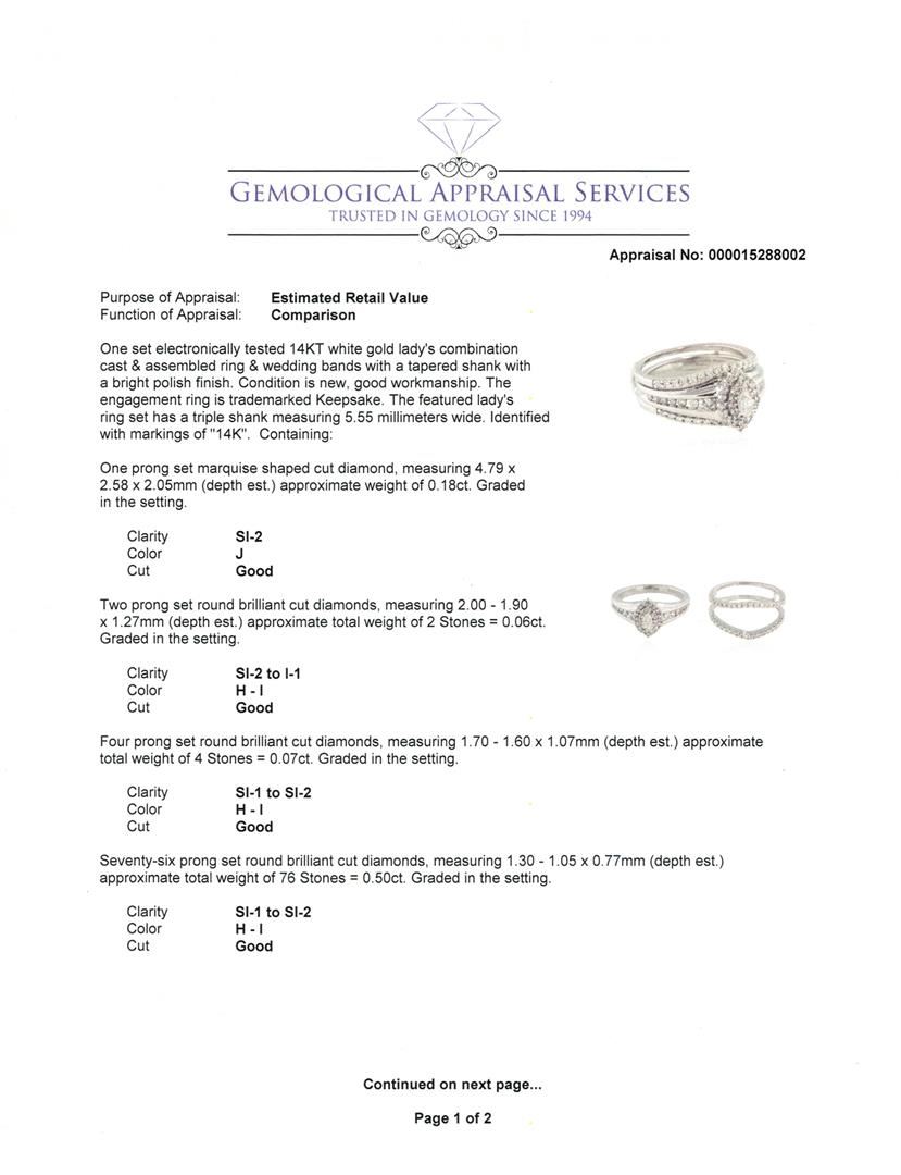 One set electronically tested 14KT white gold lady's combination cast & assembled ring & wedding bands with a tapered shank with a bright polish finish. The engagement ring is trademarked Keepsake. The featured lady's ring set has a triple shank measuring 5.55 millimeters wide. Identified with markings of "14K". Condition is new, good workmanship. Containing: One prong set marquise shaped cut diamond, measuring 4.79 x 2.58 x 2.05mm (depth est.) approximate weight of 0.18ct. Graded in the setting. Clarity: SI-2. Color: J. Cut Good Two prong set round brilliant cut diamonds, measuring 2.00 - 1.90 x 1.27mm (depth est.) approximate total weight of 2 Stones = 0.06ct. Graded in the setting. Clarity: SI-2 to I-1. Color: H - I. Cut Good Four prong set round brilliant cut diamonds, measuring 1.70 - 1.60 x 1.07mm (depth est.) approximate total weight of 4 Stones = 0.07ct. Graded in the setting. Clarity: SI-1 to SI-2. Color: H - I. Cut Good Seventy-Six prong set round brilliant cut diamonds, measuring 1.30 - 1.05 x 0.77mm (depth est.) approximate total weight of 76 Stones = 0.50ct. Graded in the setting. Clarity: SI-1 to SI-2. Color: H - I. Cut Good. Total Weight of Diamonds 0.81ct. Total Weight of Ring & Wedding Bands 7.20gm. GAS Appraised at $3,735.00.