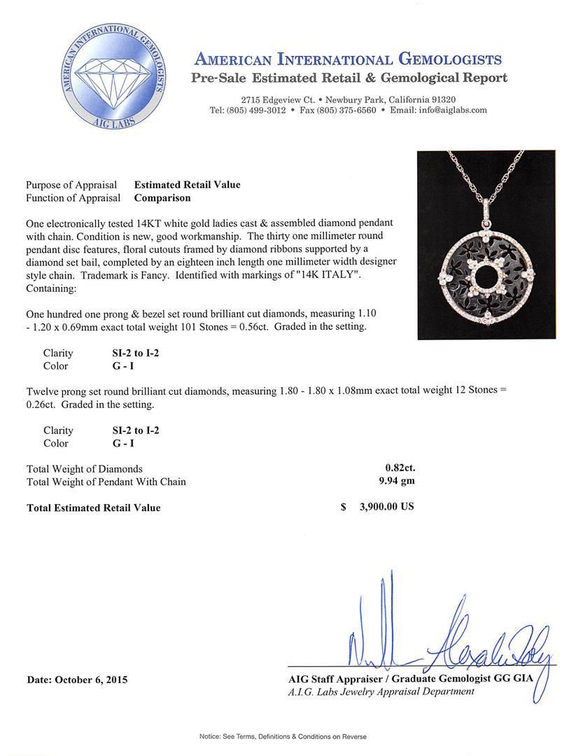 One electronically tested 14KT white gold ladies cast & assembled diamond pendant with chain. The thirty one millimeter round pendant disc features, floral cutouts framed by diamond ribbons supported by a diamond set bail, completed by an eighteen inch length one millimeter width designer style chain. Trademark is Fancy. Identified with markings of "14K ITALY". Condition is new, good workmanship. Containing: One Hundred One prong & bezel set round brilliant cut diamonds, measuring 1.10 - 1.20 x 0.69mm exact total weight 101 Stones = 0.56ct. Graded in the setting. Clarity: SI-2 to I-2. Color: G - I Twelve prong set round brilliant cut diamonds, measuring 1.80 - 1.80 x 1.08mm exact total weight 12 Stones = 0.26ct. Graded in the setting. Clarity: SI-2 to I-2. Color: G - I. Total Weight of Diamonds 0.82ct. Total Weight of Pendant With Chain 9.94gm. AIG Appraised.
