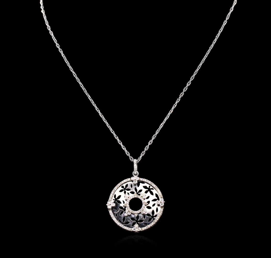 One electronically tested 14KT white gold ladies cast & assembled diamond pendant with chain. The thirty one millimeter round pendant disc features, floral cutouts framed by diamond ribbons supported by a diamond set bail, completed by an eighteen inch length one millimeter width designer style chain. Trademark is Fancy. Identified with markings of "14K ITALY". Condition is new, good workmanship. Containing: One Hundred One prong & bezel set round brilliant cut diamonds, measuring 1.10 - 1.20 x 0.69mm exact total weight 101 Stones = 0.56ct. Graded in the setting. Clarity: SI-2 to I-2. Color: G - I Twelve prong set round brilliant cut diamonds, measuring 1.80 - 1.80 x 1.08mm exact total weight 12 Stones = 0.26ct. Graded in the setting. Clarity: SI-2 to I-2. Color: G - I. Total Weight of Diamonds 0.82ct. Total Weight of Pendant With Chain 9.94gm. AIG Appraised.