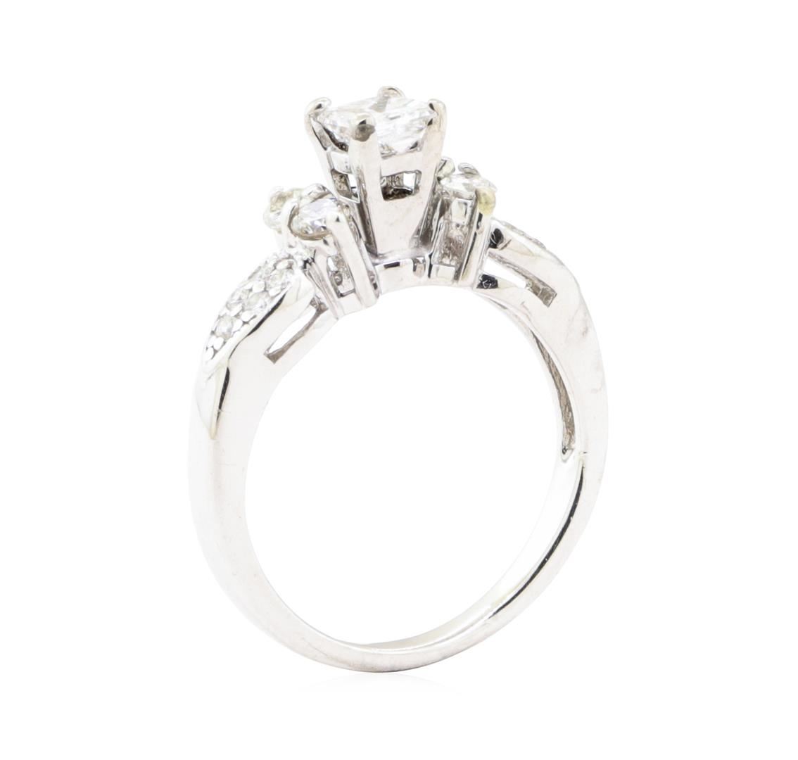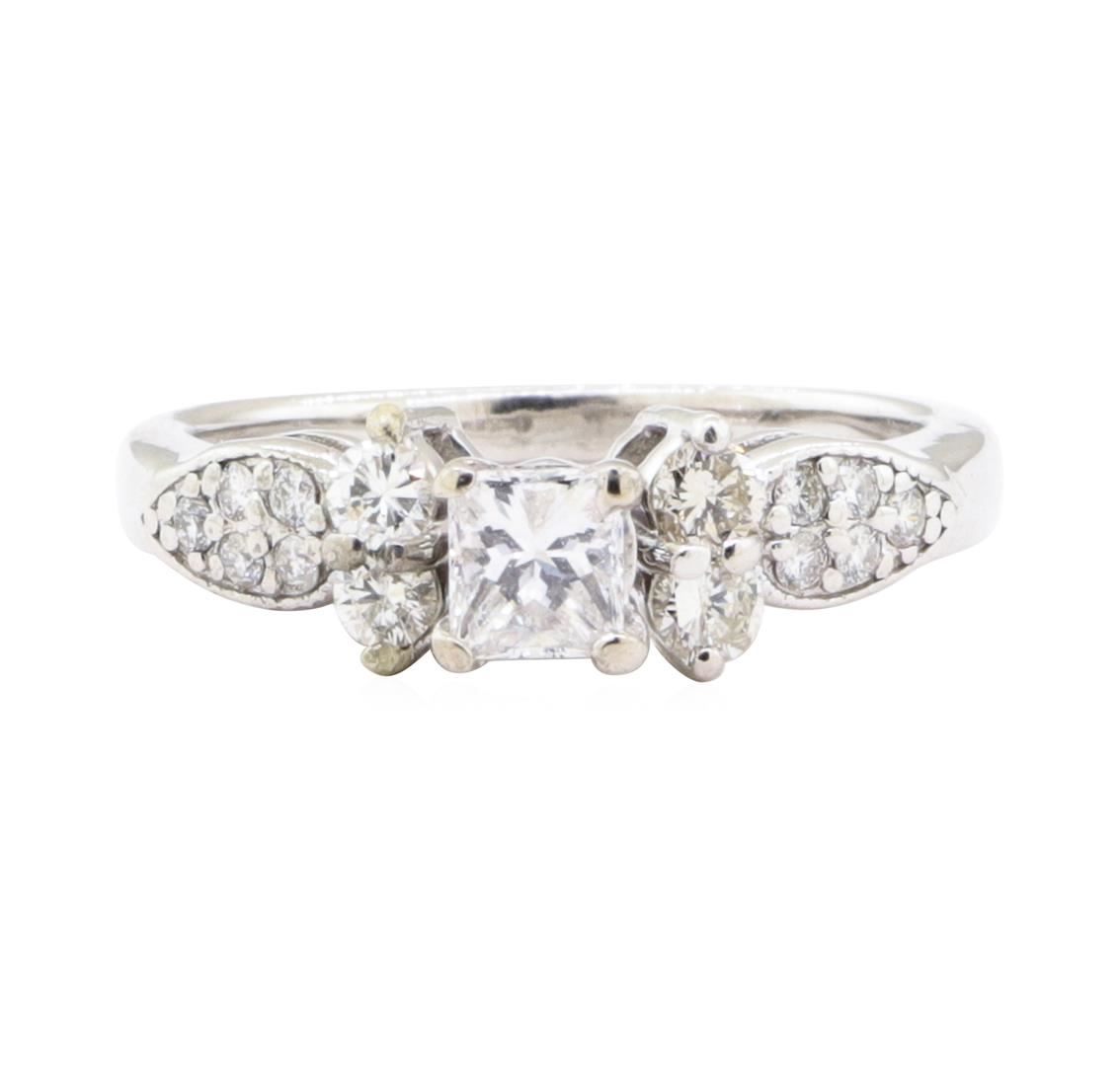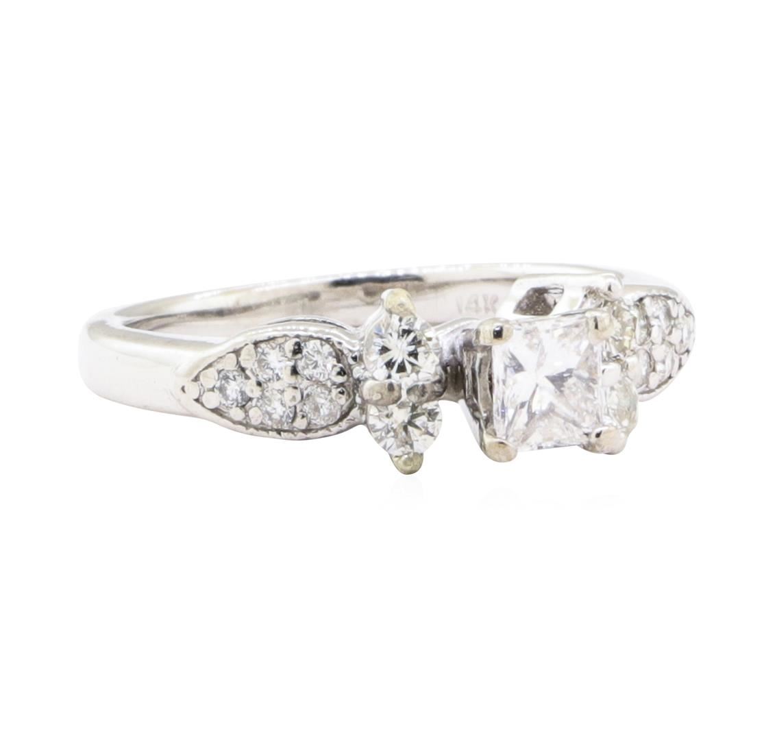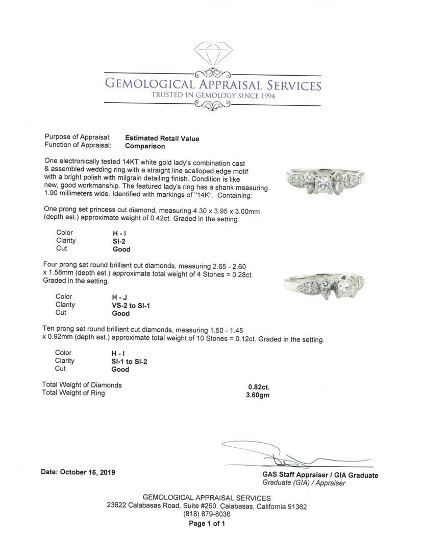 One electronically tested 14KT white gold lady's combination cast & assembled wedding ring with a straight line scalloped edge motif with a bright polish with milgrain detailing finish. The featured lady's ring has a shank measuring 1.90 millimeters wide. Identified with markings of '14K'. Condition is Good. Containing: One prong set princess cut diamond, measuring 4.30 x 3.95 x 3.00mm (depth est.) approximate weight of 0.42ct. Graded in the setting. Color H - I Clarity SI-2 Cut Good Four prong set round brilliant cut diamonds, measuring 2.65 - 2.60 x 1.58mm (depth est.) approximate total weight of 4 Stones = 0.28ct. Graded in the setting. Color H - J Clarity VS-2 to SI-1 Cut Good Ten prong set round brilliant cut diamonds, measuring 1.50 - 1.45 x 0.92mm (depth est.) approximate total weight of 10 Stones = 0.12ct. Graded in the setting. Color H - I Clarity SI-1 to SI-2 Cut Good. Total Weight of Diamonds 0.82ct.. Total Weight of Ring 3.60gm GAS Appraised at $2900.00. GAS Appraised.