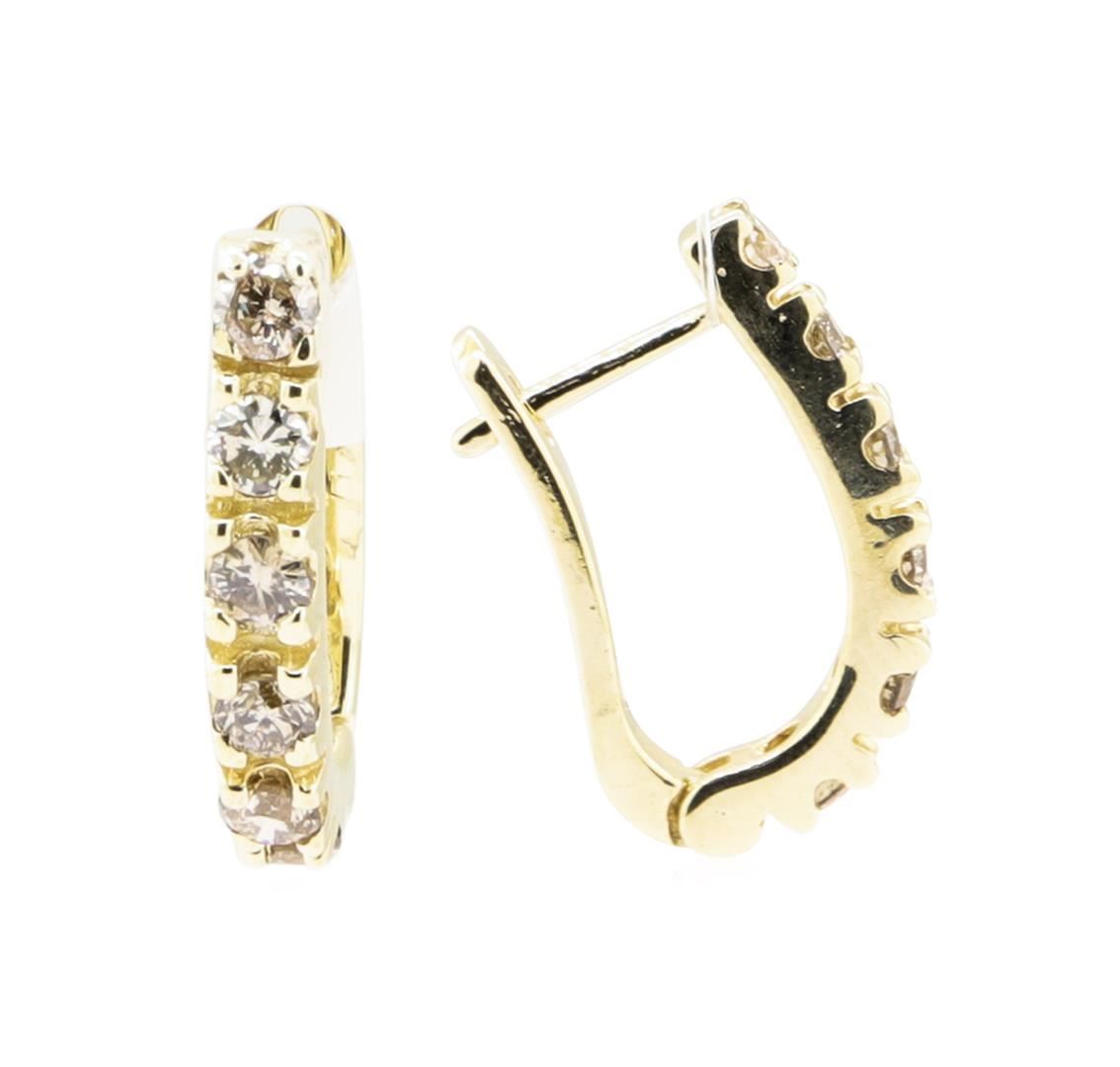 One pair electronically tested 14KT yellow gold lady's combination cast & assembled j-hoop earrings with hinged clip backs with a bright polish finish. Identified with markings of '14K'. Condition is new, good workmanship. Containing: Twelve prong set rou GAS Appraised.