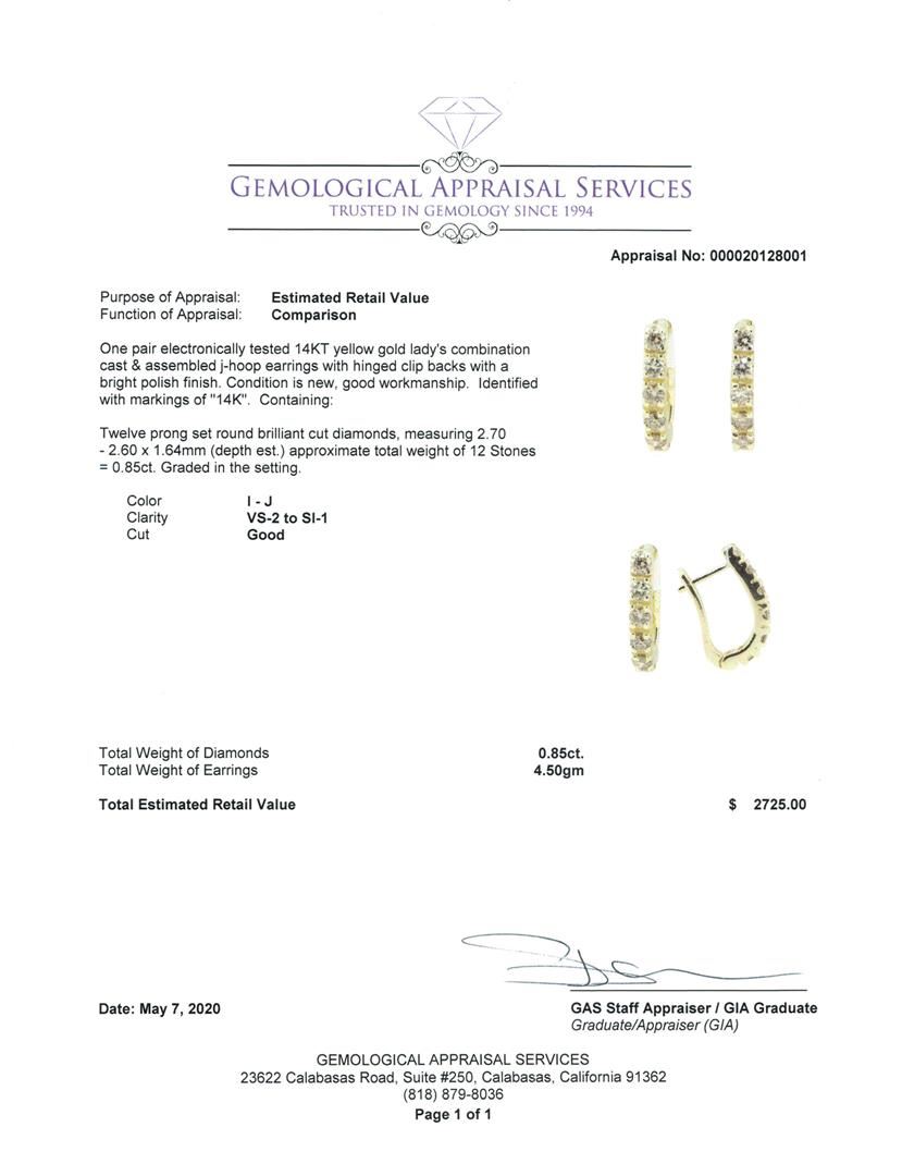 One pair electronically tested 14KT yellow gold lady's combination cast & assembled j-hoop earrings with hinged clip backs with a bright polish finish. Identified with markings of '14K'. Condition is new, good workmanship. Containing: Twelve prong set round brilliant cut diamonds, measuring 2.70 - 2.60 x 1.64mm (depth est.) approximate total weight of 12 Stones = 0.85ct. Graded in the setting. Color I - J Clarity VS-2 to SI-1 Cut Good. Total Weight of Diamonds 0.85ct.. Total Weight of Earrings 4.50gm GAS Appraised at $2725.00. GAS Appraised.