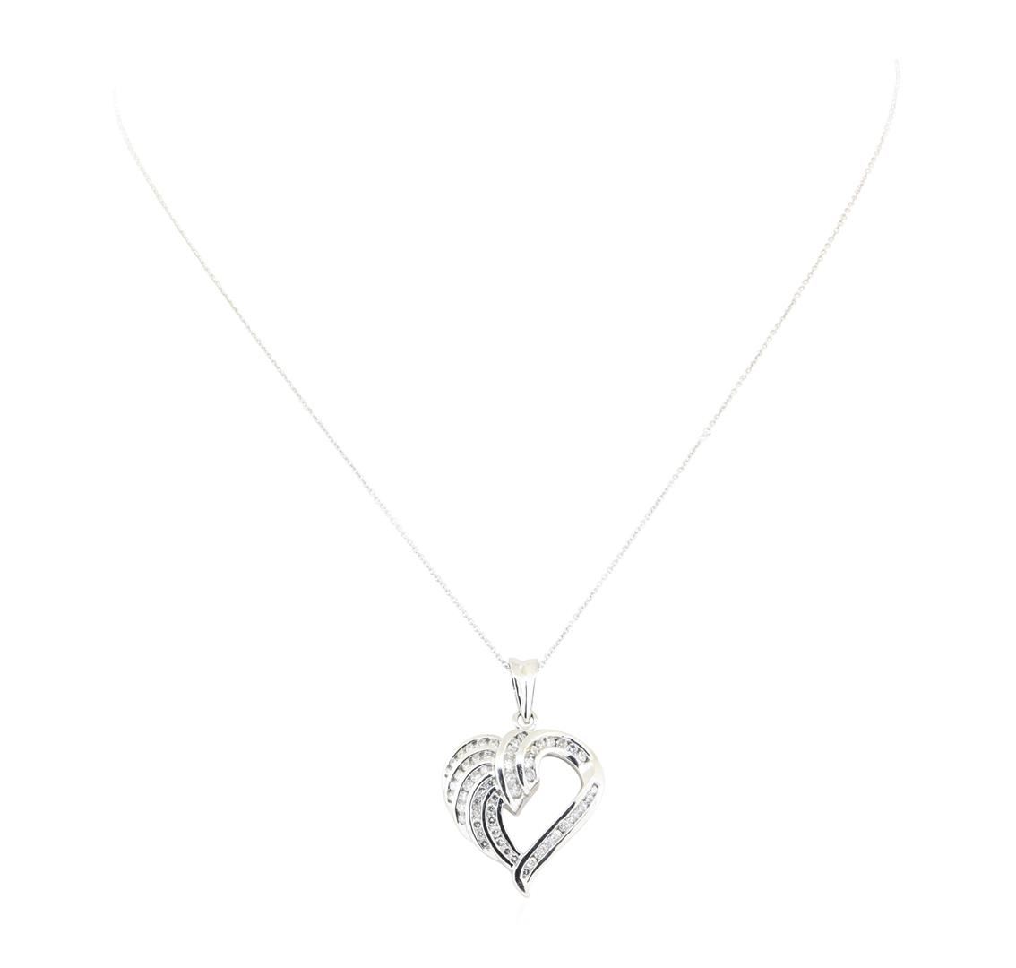 One heart shaped pendant with chain featuring: 14KT white gold weighing 5.6 grams containing diamonds weighing 0.85ctw. The chain is a 1mm rounded cable link chain measuring sixteen inches in length.