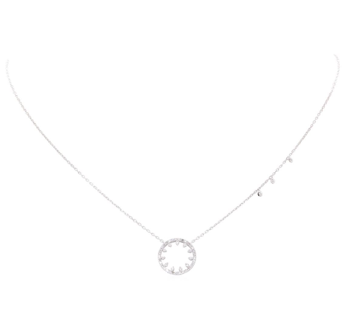 One necklace featuring: 14KT white gold weighing 3.5 grams containing diamonds weighing 0.85ctw. The necklace has an attached eighteen inch long 1.2mm diamond cut oval cable link chain.