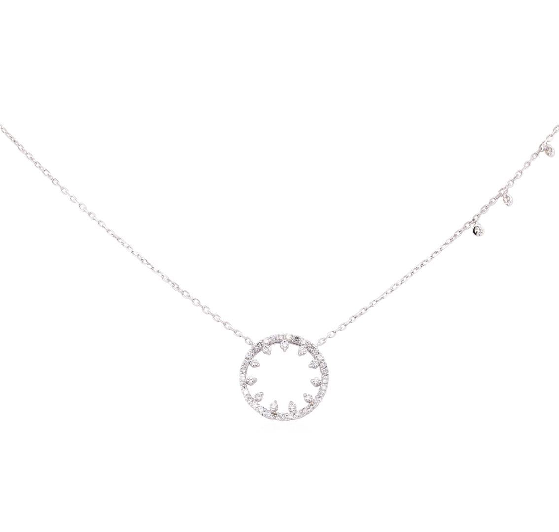 One necklace featuring: 14KT white gold weighing 3.5 grams containing diamonds weighing 0.85ctw. The necklace has an attached eighteen inch long 1.2mm diamond cut oval cable link chain.