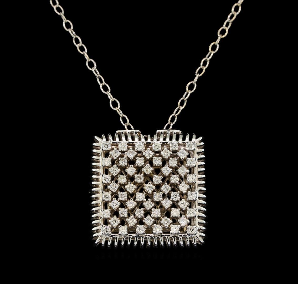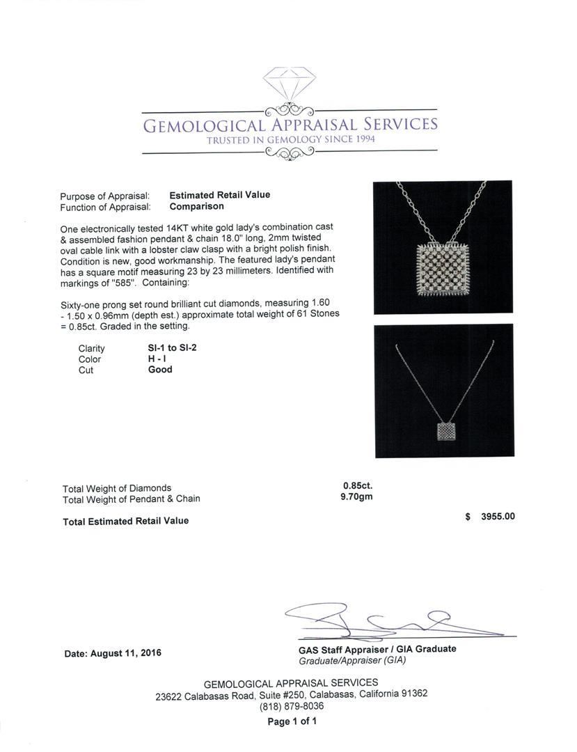 One electronically tested 14KT white gold lady's combination cast & assembled fashion pendant & chain 18.0' long, 2mm twisted oval cable link with a lobster claw clasp with a bright polish finish. The featured lady's pendant has a square motif measuring 23 by 23 millimeters. Identified with markings of '585'. Condition is new, good workmanship. Containing: Sixty-One prong set round brilliant cut diamonds, measuring 1.60 - 1.50 x 0.96mm (depth est.) approximate total weight of 61 Stones = 0.85ct. Graded in the setting. Clarity SI-1 to SI-2. Color: H - I Cut Good. Total Weight of Diamonds 0.85ct.. Total Weight of Pendant & Chain 9.70gm. GAS Appraised.
