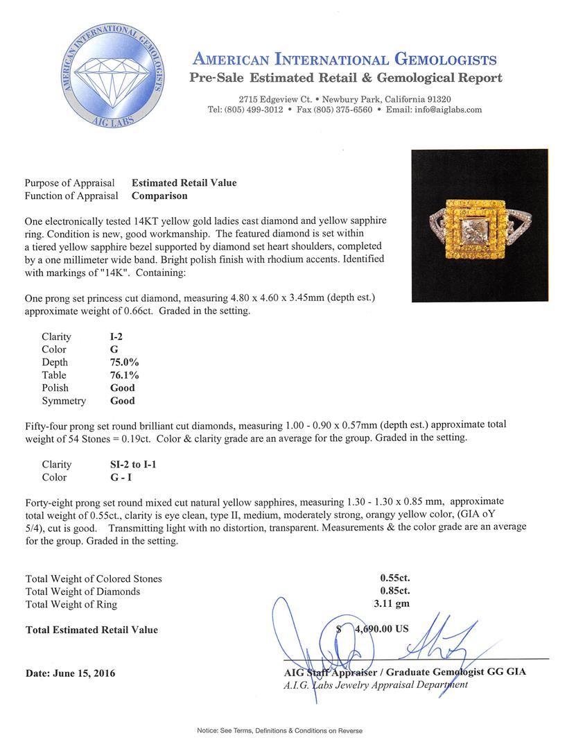 One electronically tested 14KT yellow gold ladies cast diamond and yellow sapphire ring. The featured diamond is set within a tiered yellow sapphire bezel supported by diamond set heart shoulders, completed by a one millimeter wide band. Bright polish finish with rhodium accents. Identified with markings of "14K". Condition is new, good workmanship. Containing: One prong set princess cut diamond, measuring 4.80 x 4.60 x 3.45mm (depth est.) approximate weight of 0.66ct. Graded in the setting. Clarity: I-2. Color: GDepth 75.0%. Table 76.1%. Fifty-Four prong set round brilliant cut diamonds, measuring 1.00 - 0.90 x 0.57mm (depth est.) approximate total weight of 54 Stones = 0.19ct. Color & clarity grade are an average for the group. Graded in the setting. Clarity: SI-2 to I-1. Color: G - I Forty-eight prong set round mixed cut natural yellow sapphires, measuring 1.30 - 1.30 x 0.85 mm, approximate total weight of 0.55ct., clarity is eye clean, type II, medium, moderately strong, orangy yellow color, (GIA oY 5/4), cut is good. Transmitting light with no distortion, transparent. Measurements & the color grade are an average for the group. Graded in the setting.Total Weight of Colored Stones 0.55ct. Total Weight of Diamonds 0.85ct. Total Weight of Ring 3.11gm. AIG Appraised.