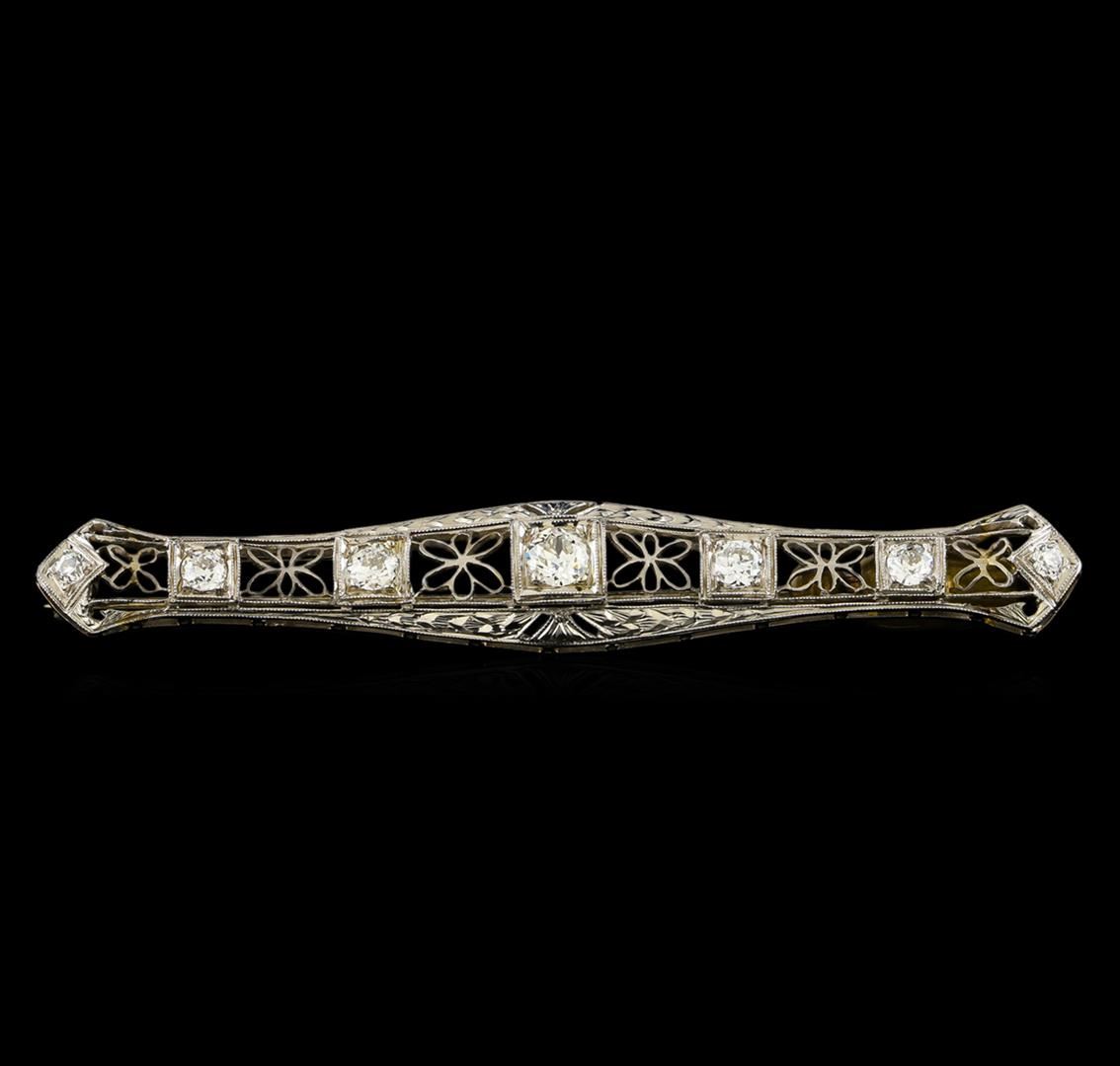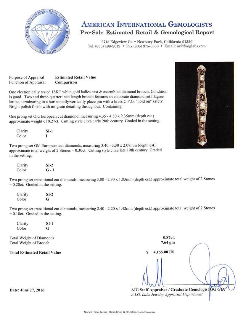 One electronically tested 18KT white gold ladies cast & assembled diamond brooch. Two and three-quarter inch length brooch features an elaborate diamond set filagree lattice, terminating in a horizontally/vertically place pin with a brass C.P.G. "hold on" safety. Bright polish finish with milgrain detailing throughout. Condition is good. Containing: One prong set Old European cut diamond, measuring 4.35 - 4.30 x 2.35mm (depth est.) approximate weight of 0.27ct. Cutting style circa early 20th century. Graded in the setting. Clarity: SI-1. Color: I Two prong set Old European cut diamonds, measuring 3.40 - 3.30 x 2.08mm (depth est.) approximate total weight of 2 Stones = 0.30ct. Cutting style circa late 19th century. Graded in the setting. Clarity: SI-2. Color: G - I Two prong set transitional cut diamonds, measuring 3.00 - 2.90 x 1.83mm (depth est.) approximate total weight of 2 Stones = 0.20ct. Graded in the setting. Clarity: SI-2. Color: G Two prong set transitional cut diamonds, measuring 2.40 - 2.20 x 1.42mm (depth est.) approximate total weight of 2 Stones = 0.10ct. Graded in the setting. Clarity: SI-1. Color: G. Total Weight of Diamonds 0.87ct. Total Weight of Brooch 7.64gm. AIG Appraised.