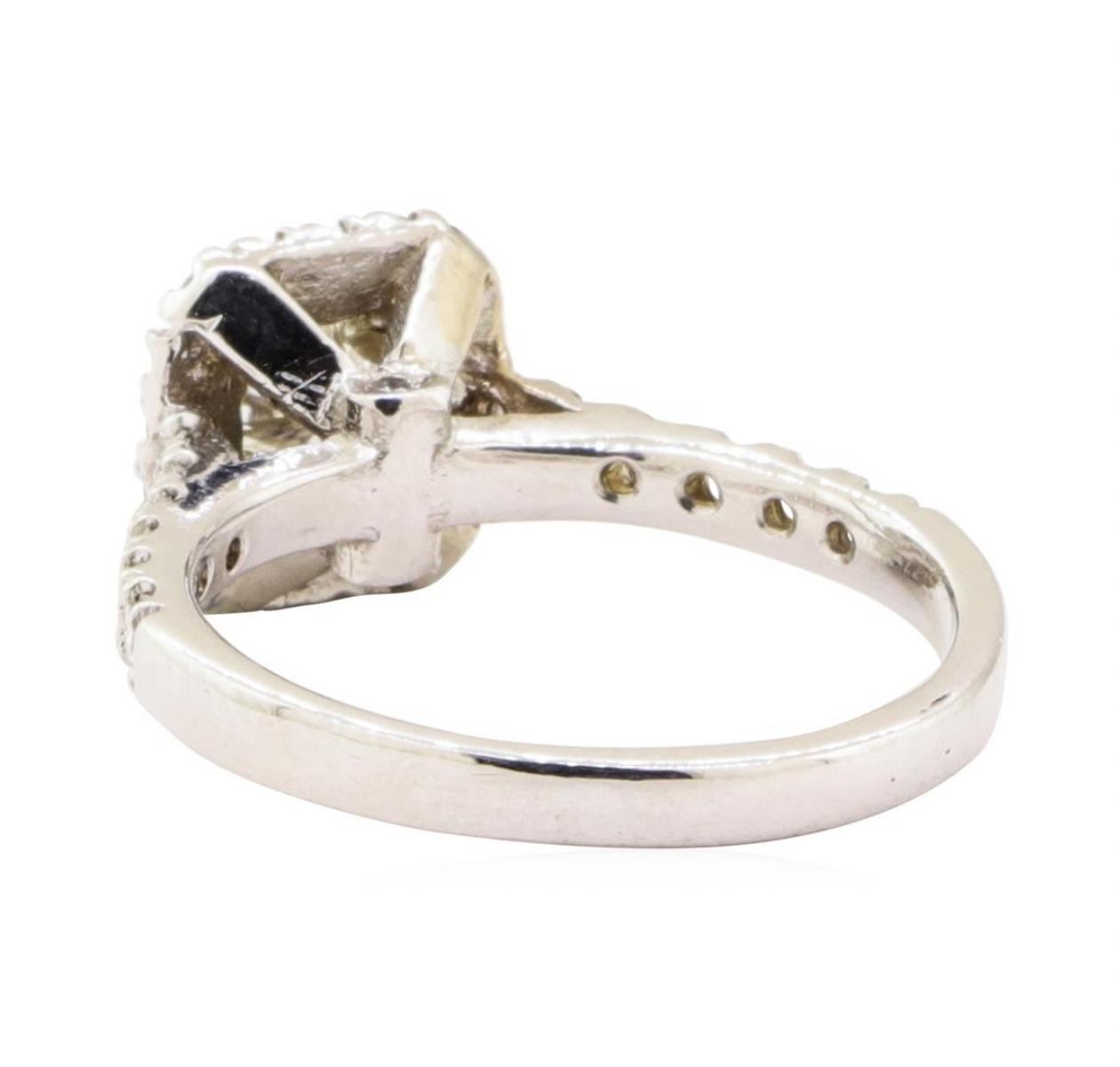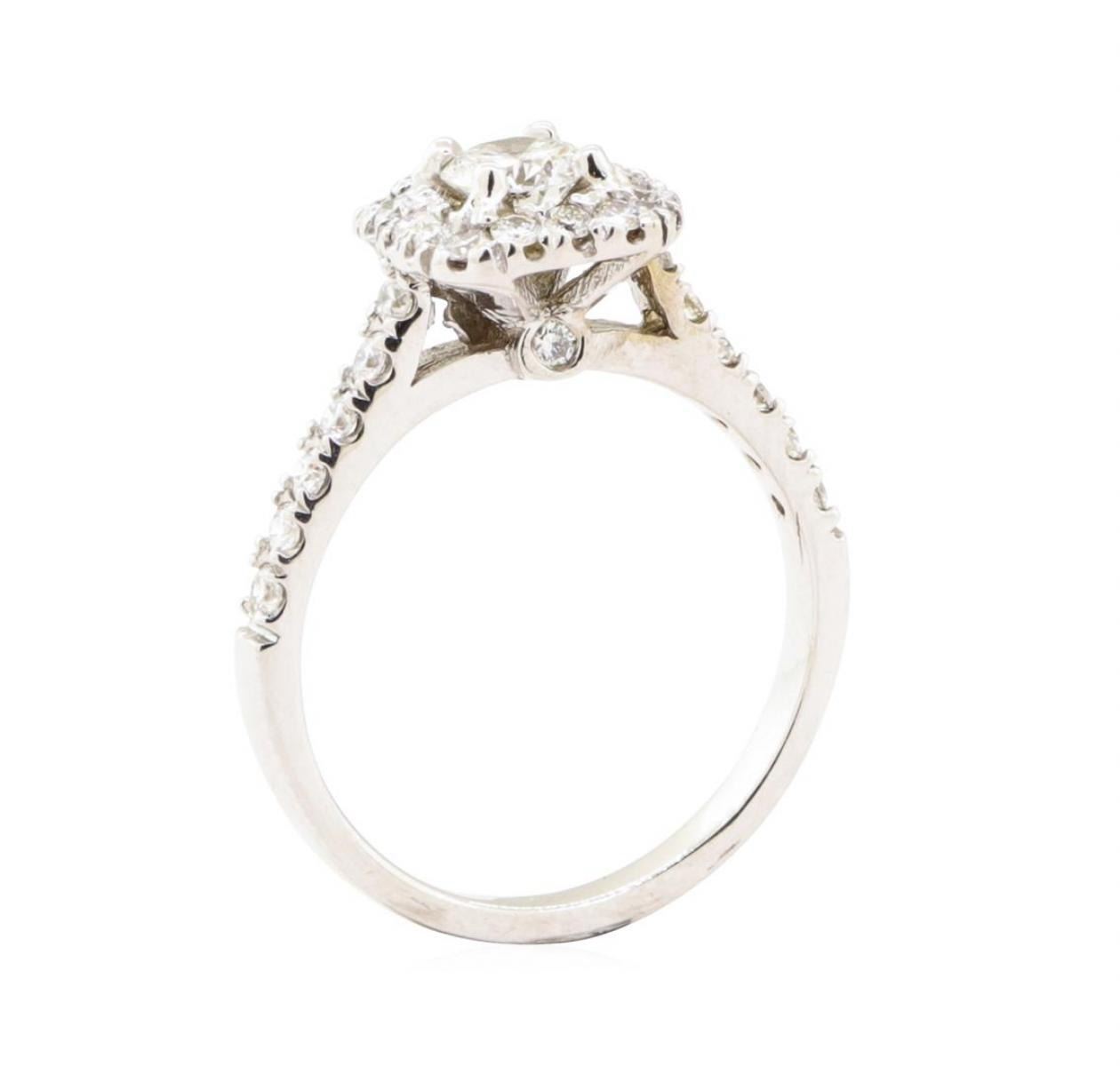 One electronically tested 14KT white gold lady's cast wedding ring with a cathedral square cushion halo with a bright polish finish. The featured lady's ring has a shank measuring approximately 2.07 millimeters in width. Trademark is MJ. Identified with m GAS Appraised.