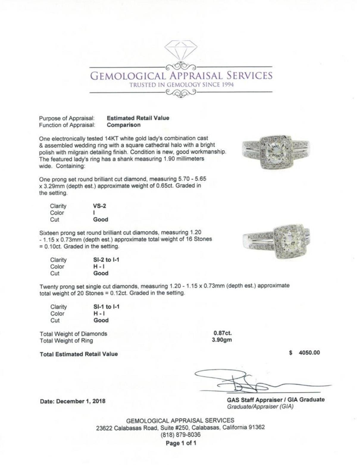 One electronically tested 14KT white gold lady's combination cast & assembled wedding ring with a square cathedral halo with a bright polish with milgrain detailing finish. The featured lady's ring has a shank measuring 1.90 millimeters wide. Condition is new, good workmanship. Containing: One prong set round brilliant cut diamond, measuring 5.70 - 5.65 x 3.29mm (depth est.) approximate weight of 0.65ct. Graded in the setting. Color I Clarity VS-2 Cut Good Sixteen prong set round brilliant cut diamonds, measuring 1.20 - 1.15 x 0.73mm (depth est.) approximate total weight of 16 Stones = 0.10ct. Graded in the setting. Color H - I Clarity SI-2 to I-1 Cut Good Twenty prong set single cut diamonds, measuring 1.20 - 1.15 x 0.73mm (depth est.) approximate total weight of 20 Stones = 0.12ct. Graded in the setting. Color H - I Clarity SI-1 to I-1 Cut Good. Total Weight of Diamonds 0.87ct.. Total Weight of Ring 3.90gm GAS Appraised at $4050.00. GAS Appraised.