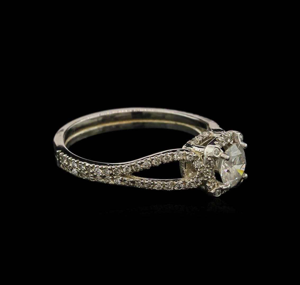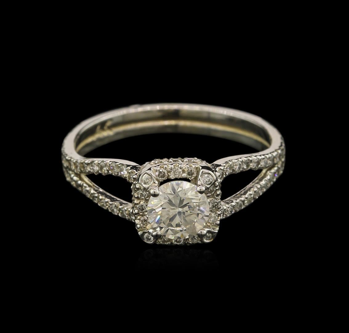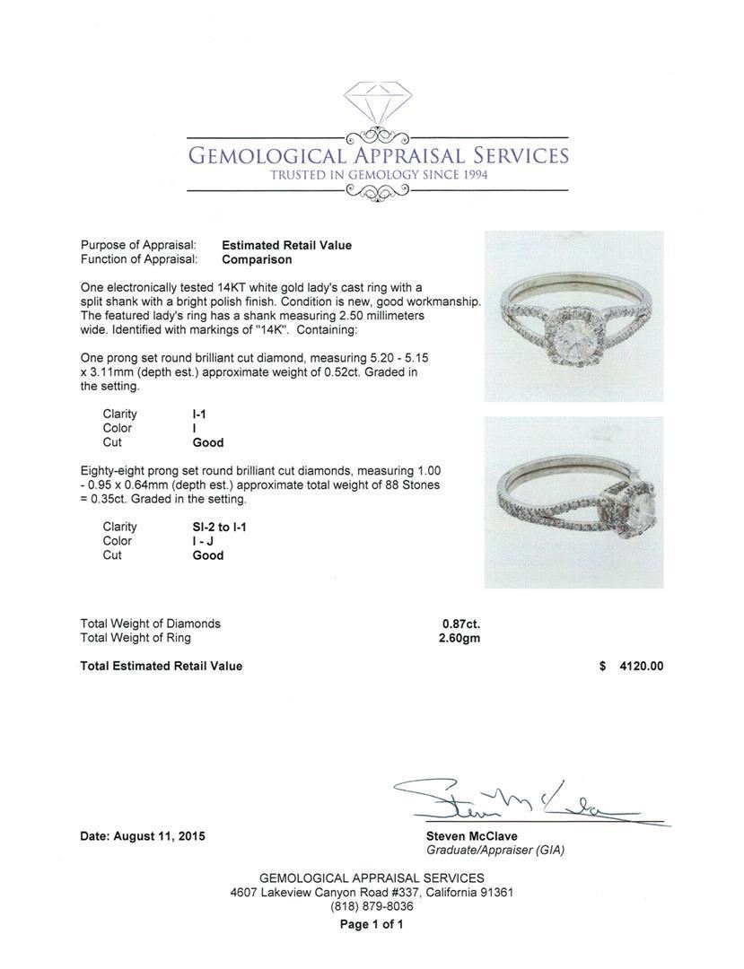 One electronically tested 14KT white gold lady's cast ring with a split shank with a bright polish finish. The featured lady's ring has a shank measuring 2.50 millimeters wide. Identified with markings of "14K". Condition is new, good workmanship. Containing: One prong set round brilliant cut diamond, measuring 5.20 - 5.15 x 3.11mm (depth est.) approximate weight of 0.52ct. Graded in the setting. Clarity: I-1. Color: I. Cut Good Eighty-Eight prong set round brilliant cut diamonds, measuring 1.00 - 0.95 x 0.64mm (depth est.) approximate total weight of 88 Stones = 0.35ct. Graded in the setting. Clarity: SI-2 to I-1. Color: I - Good. Total Weight of Diamonds 0.87ct. Total Weight of Ring 2.60gm. GAS Appraised.