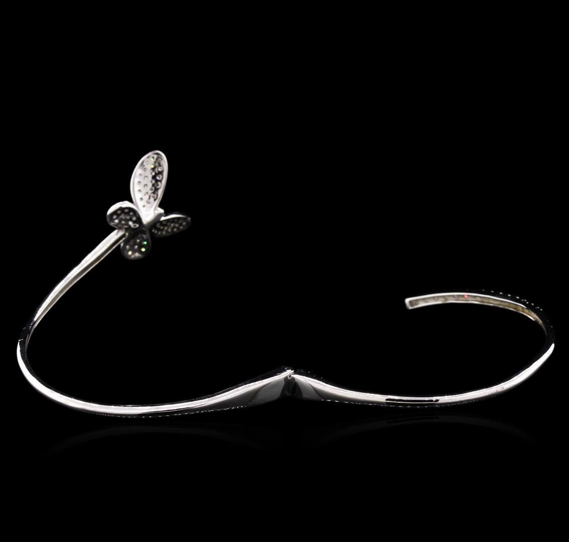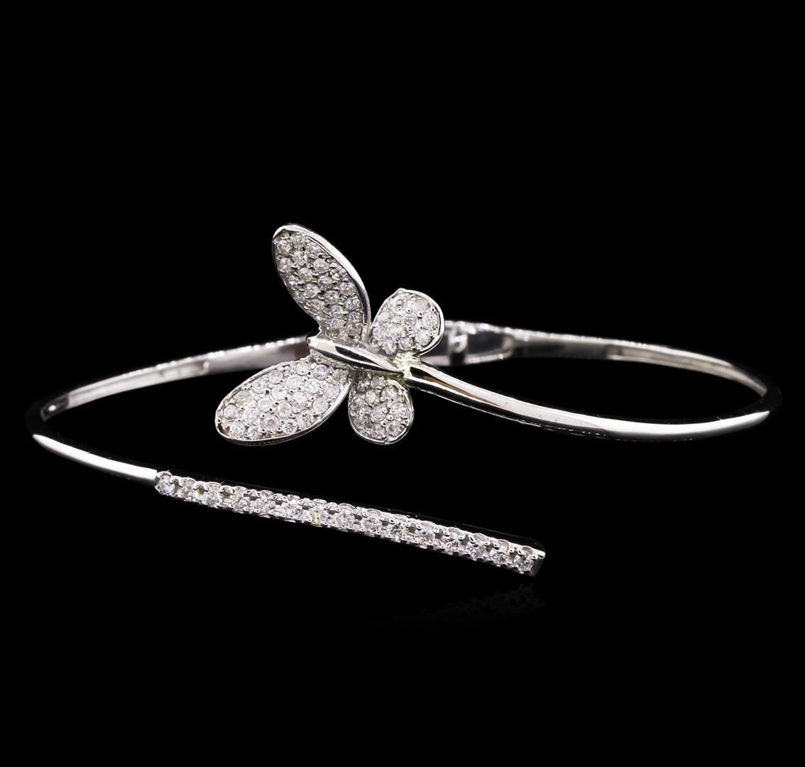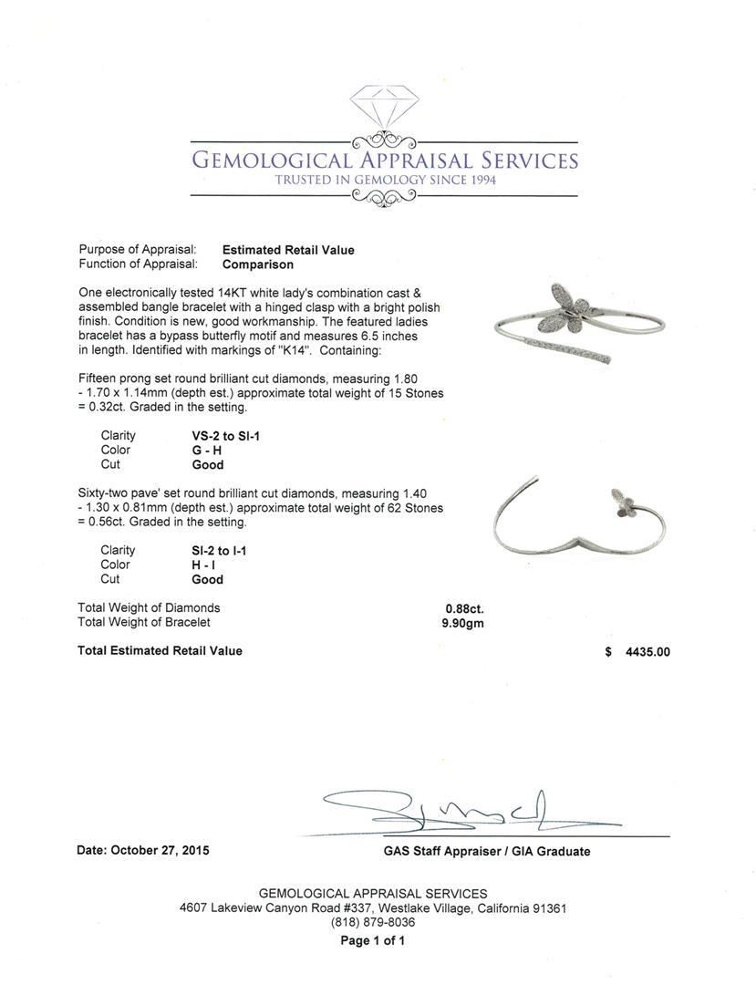 One electronically tested 14KT white lady's combination cast & assembled bangle bracelet with a hinged clasp with a bright polish finish. The featured ladies bracelet has a bypass butterfly motif and measures 6.5 inches in length. Identified with markings of "K14". Condition is new, good workmanship. Containing: Fifteen prong set round brilliant cut diamonds, measuring 1.80 - 1.70 x 1.14mm (depth est.) approximate total weight of 15 Stones = 0.32ct. Graded in the setting. Clarity: VS-2 to SI-1. Color: G - H. Cut Good Sixty-Two pave' set round brilliant cut diamonds, measuring 1.40 - 1.30 x 0.81mm (depth est.) approximate total weight of 62 Stones = 0.56ct. Graded in the setting. Clarity: SI-2 to I-1. Color: H - I. Cut Good. Total Weight of Diamonds 0.88ct. Total Weight of Bracelet 9.90gm. GAS Appraised.