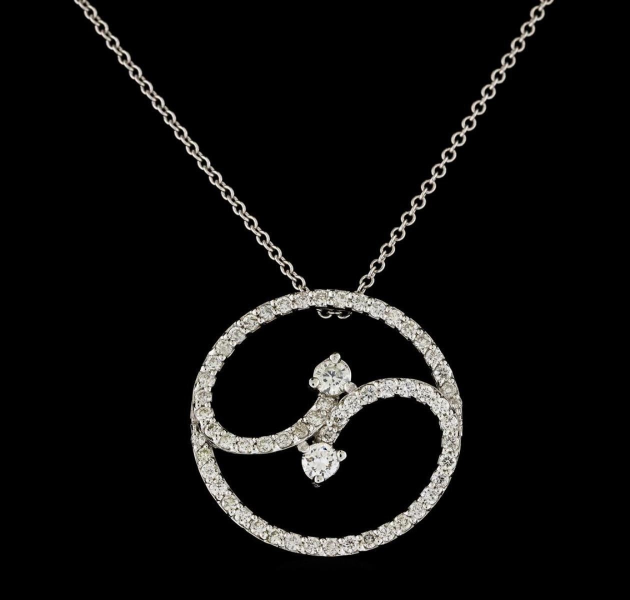 One Diamond Pendant with Chain featuring: 14KT White Gold with a total weight of 3.05 grams, Two Diamonds with a total weight of 0.20 ctw, and 58 Diamonds with a total weight of 0.68ctw.
