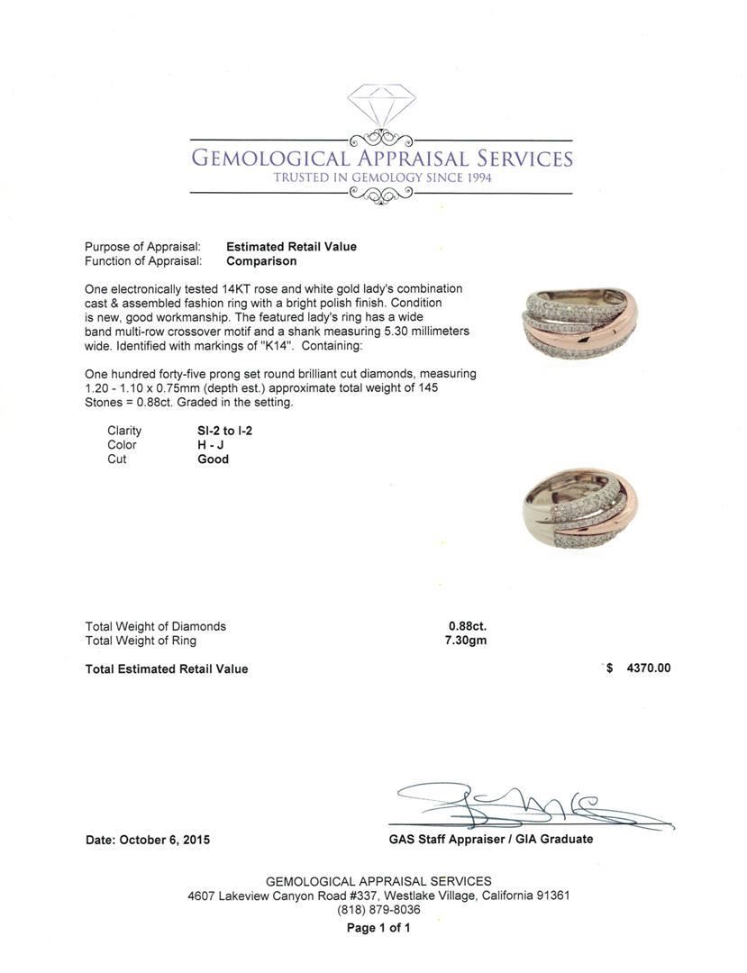 One electronically tested 14KT rose and white gold lady's combination cast & assembled fashion ring with a bright polish finish. The featured lady's ring has a wide band multi-row crossover motif and a shank measuring 5.30 millimeters wide. Identified with markings of "K14". Condition is new, good workmanship. Containing: One Hundred Forty-Five prong set round brilliant cut diamonds, measuring 1.20 - 1.10 x 0.75mm (depth est.) approximate total weight of 145 Stones = 0.88ct. Graded in the setting. Clarity: SI-2 to I-2. Color: H - Good. Total Weight of Diamonds 0.88ct. Total Weight of Ring 7.30gm. GAS Appraised.