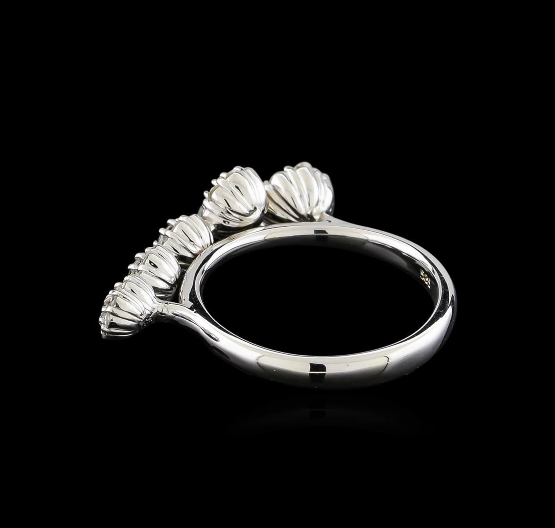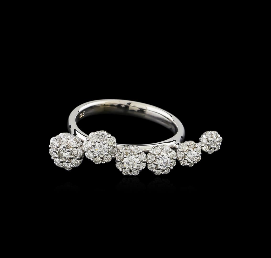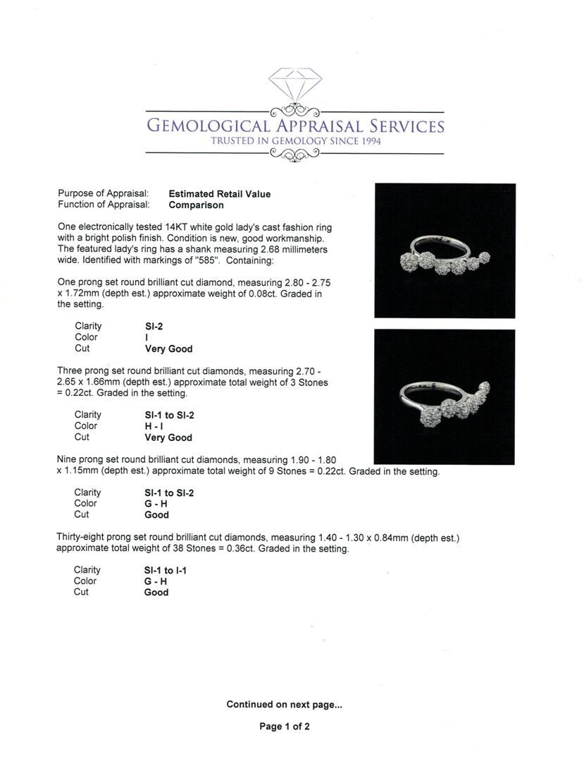 One electronically tested 14KT white gold lady's cast fashion ring with a bright polish finish. The featured lady's ring has a shank measuring 2.68 millimeters wide. Identified with markings of "585". Condition is new, good workmanship. Containing: One prong set round brilliant cut diamond, measuring 2.80 - 2.75 x 1.72mm (depth est.) approximate weight of 0.08ct. Graded in the setting. Clarity: SI-2. Color: I. Cut Very Good Three prong set round brilliant cut diamonds, measuring 2.70 - 2.65 x 1.66mm (depth est.) approximate total weight of 3 Stones = 0.22ct. Graded in the setting. Clarity: SI-1 to SI-2. Color: H - I. Cut Very Good Nine prong set round brilliant cut diamonds, measuring 1.90 - 1.80 x 1.15mm (depth est.) approximate total weight of 9 Stones = 0.22ct. Graded in the setting. Clarity: SI-1 to SI-2. Color: G - Good Thirty-Eight prong set round brilliant cut diamonds, measuring 1.40 - 1.30 x 0.84mm (depth est.) approximate total weight of 38 Stones = 0.36ct. Graded in the setting. Clarity: SI-1 to I-1. Color: G - Good. Total Weight of Diamonds 0.88ct. Total Weight of Ring 4.20gm. GAS Appraised at $3,040.00.