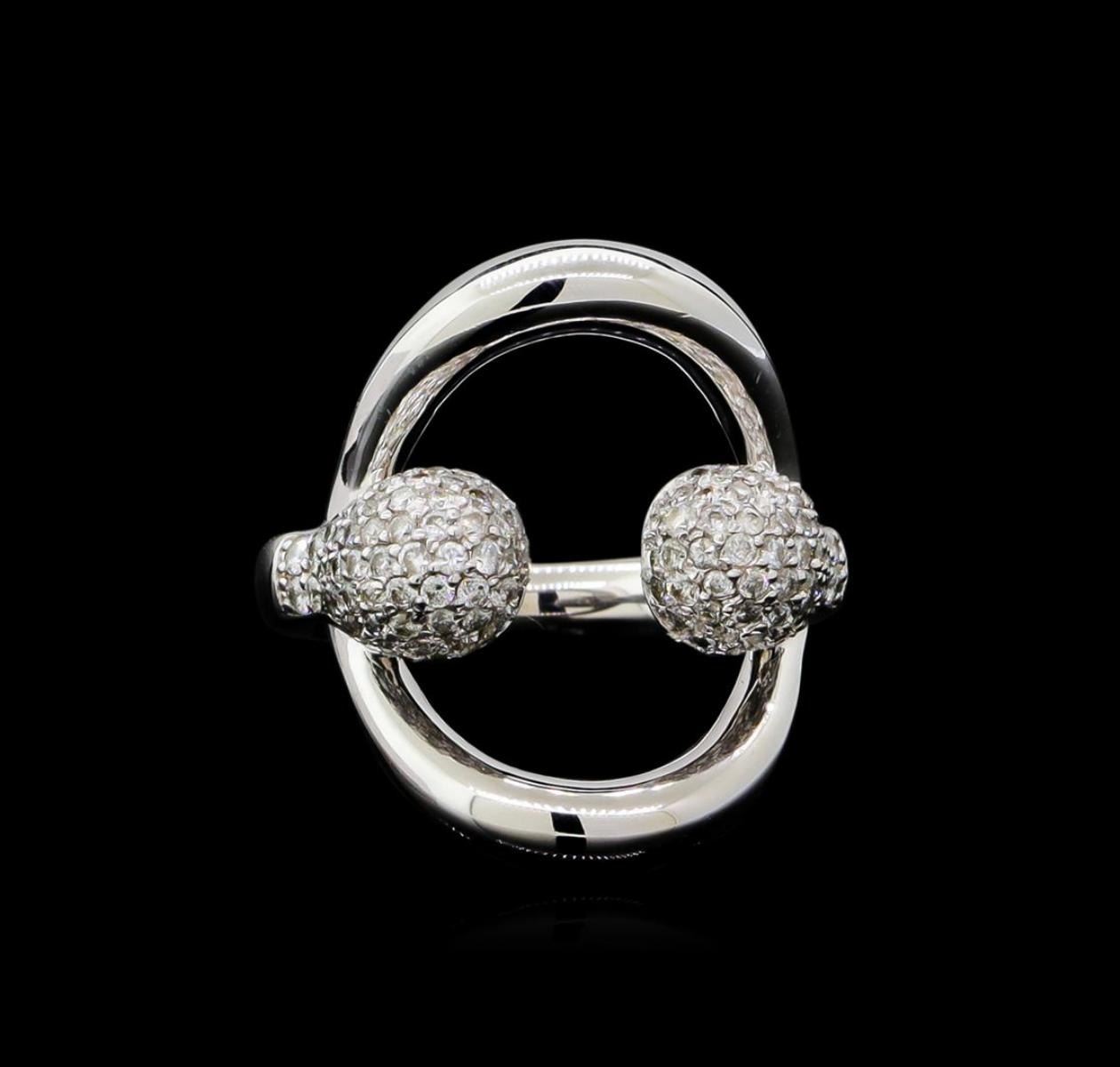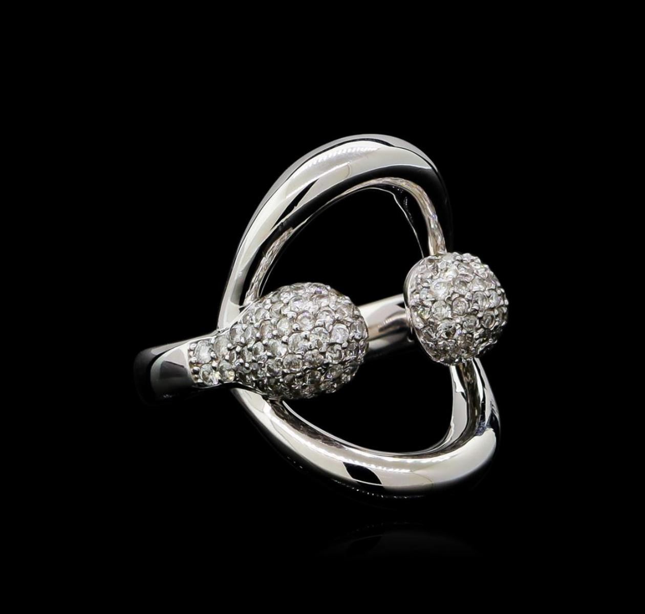 One electronically tested 14KT white gold ladies cast diamond ring with a bright polish finish. The ring features mirroring diamond clusters set within a stylized 14KT white gold oval, completed by a two and one-half millimeter wide band. Identified with markings of "585". Condition is new, good workmanship. Containing: One Hundred Eight prong set round brilliant cut diamonds approximate total weight of 108 Stones = 0.89ct. Graded in the setting. Clarity: SI-2 to I-2. Color: G - I. Total Weight of Diamonds 0.89ct. Total Weight of Ring 6.35gm. AIG Appraised.
