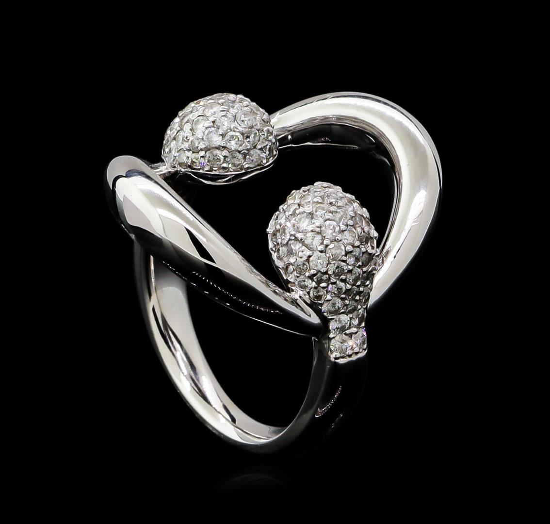 One electronically tested 14KT white gold ladies cast diamond ring with a bright polish finish. The ring features mirroring diamond clusters set within a stylized 14KT white gold oval, completed by a two and one-half millimeter wide band. Identified with markings of "585". Condition is new, good workmanship. Containing: One Hundred Eight prong set round brilliant cut diamonds approximate total weight of 108 Stones = 0.89ct. Graded in the setting. Clarity: SI-2 to I-2. Color: G - I. Total Weight of Diamonds 0.89ct. Total Weight of Ring 6.35gm. AIG Appraised.