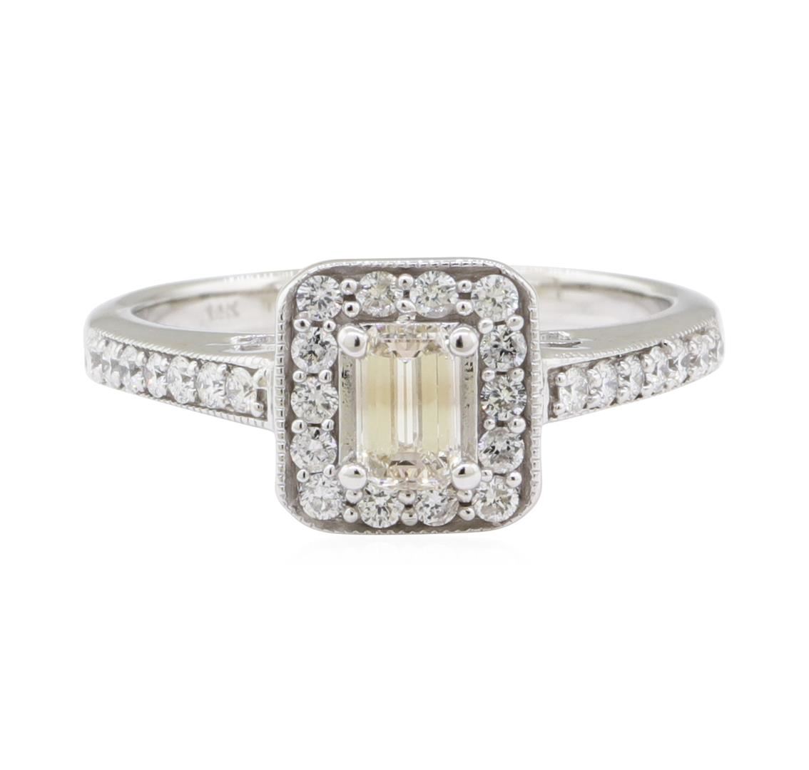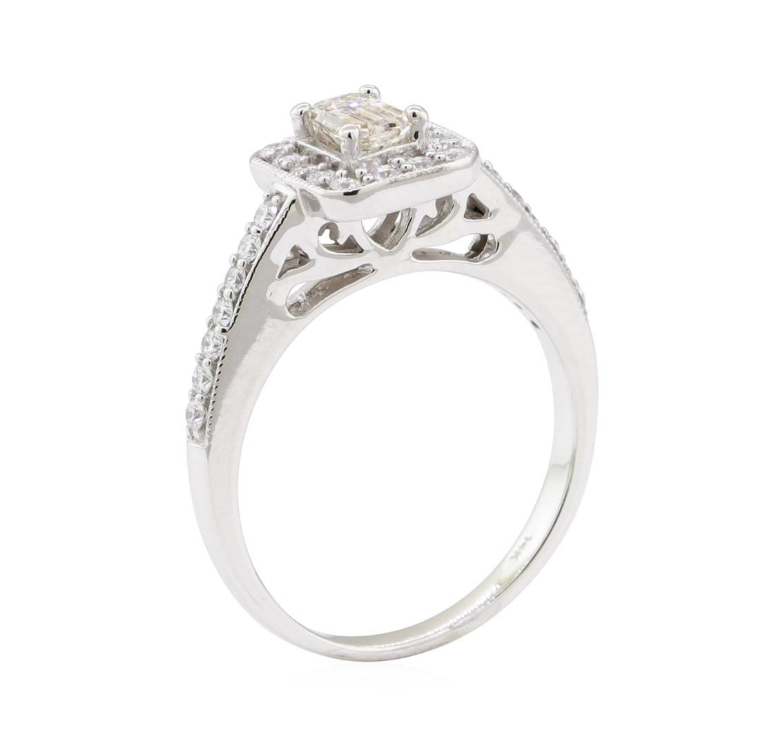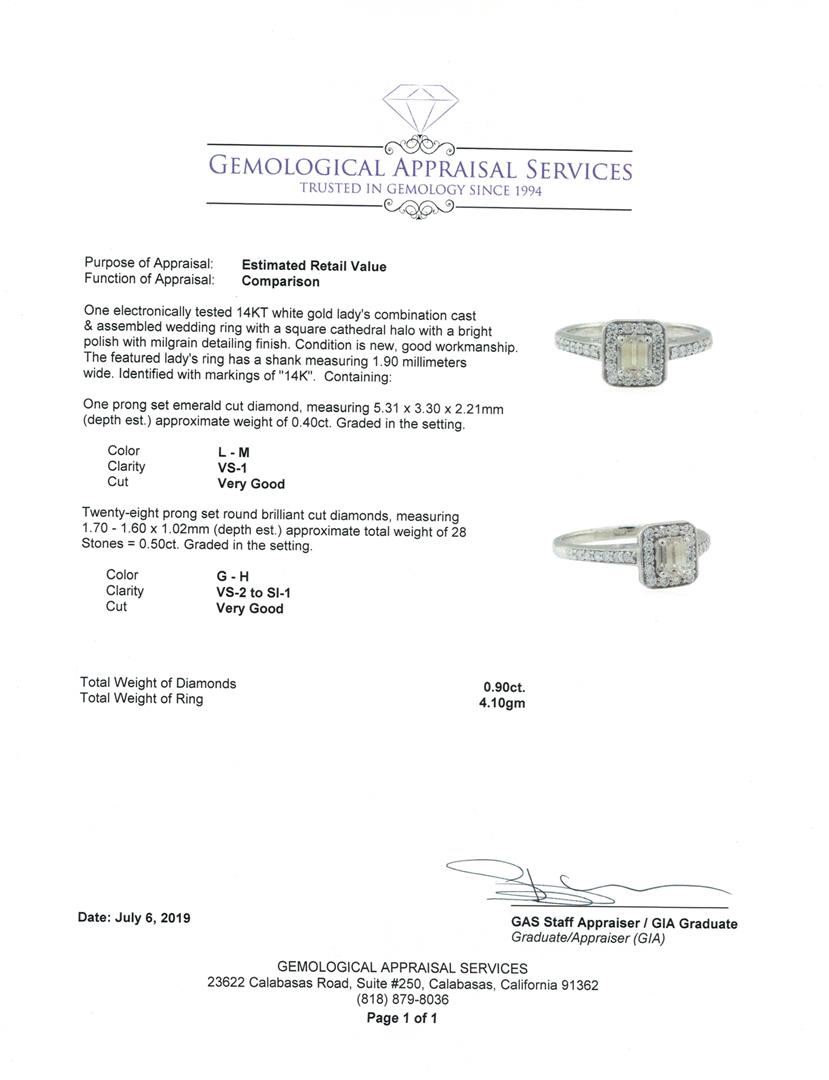 One electronically tested 14KT white gold lady's combination cast & assembled wedding ring with a square cathedral halo with a bright polish with milgrain detailing finish. The featured lady's ring has a shank measuring 1.90 millimeters wide. Identified with markings of '14K'. Condition is new, good workmanship. Containing: One prong set emerald cut diamond, measuring 5.31 x 3.30 x 2.21mm (depth est.) approximate weight of 0.40ct. Graded in the setting. Color L - M Clarity VS-1 Cut Very Good Twenty-Eight prong set round brilliant cut diamonds, measuring 1.70 - 1.60 x 1.02mm (depth est.) approximate total weight of 28 Stones = 0.50ct. Graded in the setting. Color G - H Clarity VS-2 to SI-1 Cut Very Good. Total Weight of Diamonds 0.90ct.. Total Weight of Ring 4.10gm GAS Appraised at $2970.00. GAS Appraised.