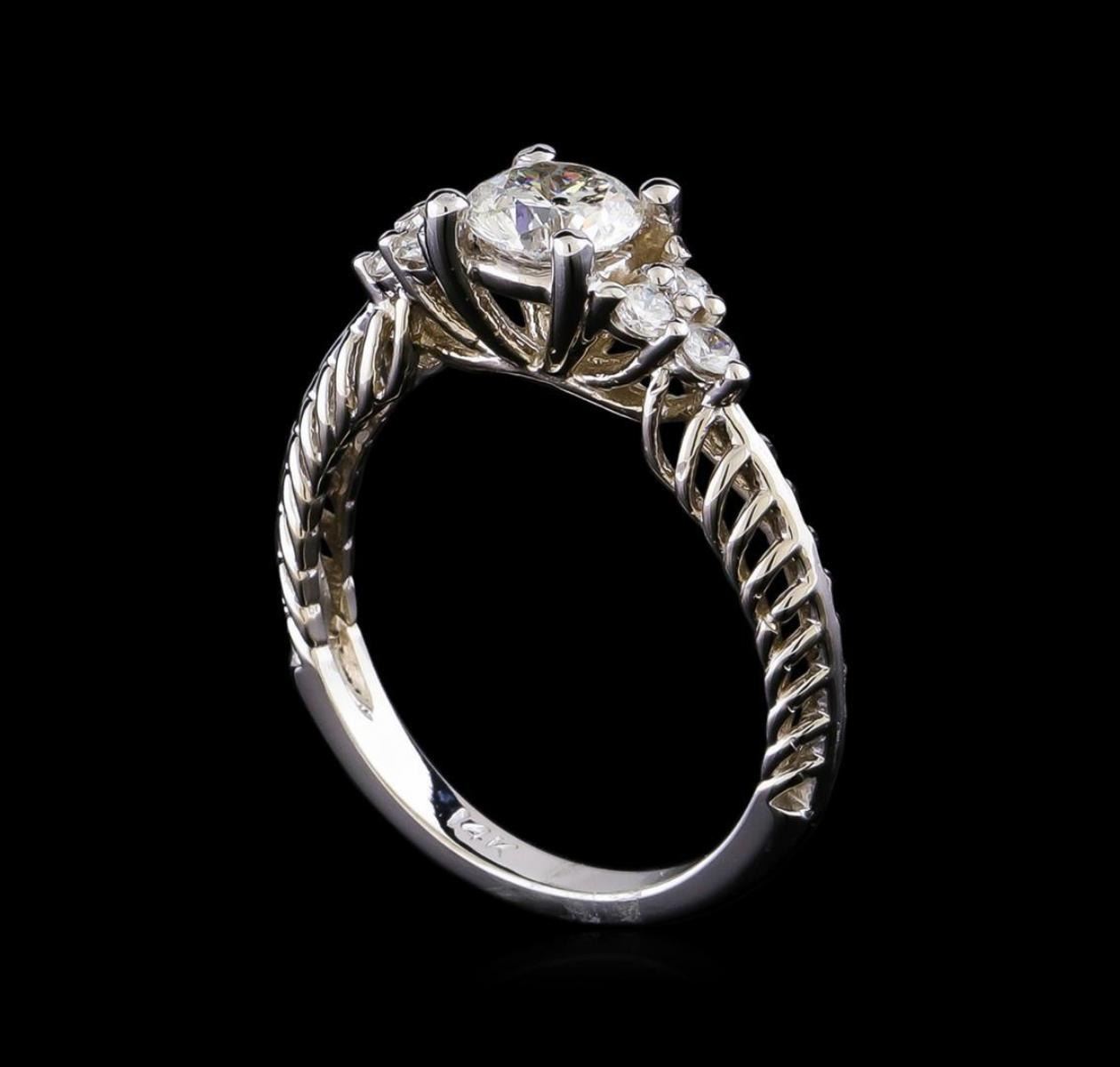 One electronically tested 14KT white gold lady's cast wedding ring with a bright polish finish. The featured lady's ring has an open scalloped shank measuring 2.30 millimeters in width. Identified with markings of "14K". Condition is new, good workmanship. Containing: One prong set round brilliant cut diamond, measuring 5.66 - 5.65 x 3.60mm (depth est.) approximate weight of 0.70ct. Graded in the setting. Clarity: I-1. Color: H - I. Cut Good Six prong set round brilliant cut diamonds, measuring 2.10 - 2.00 x 1.27mm (depth est.) approximate total weight of 6 Stones = 0.20ct. Graded in the setting. Clarity: SI-2 to I-1. Color: H - I. Cut Good. Total Weight of Diamonds 0.90ct. Total Weight of Ring 3.30gm. GAS Appraised.