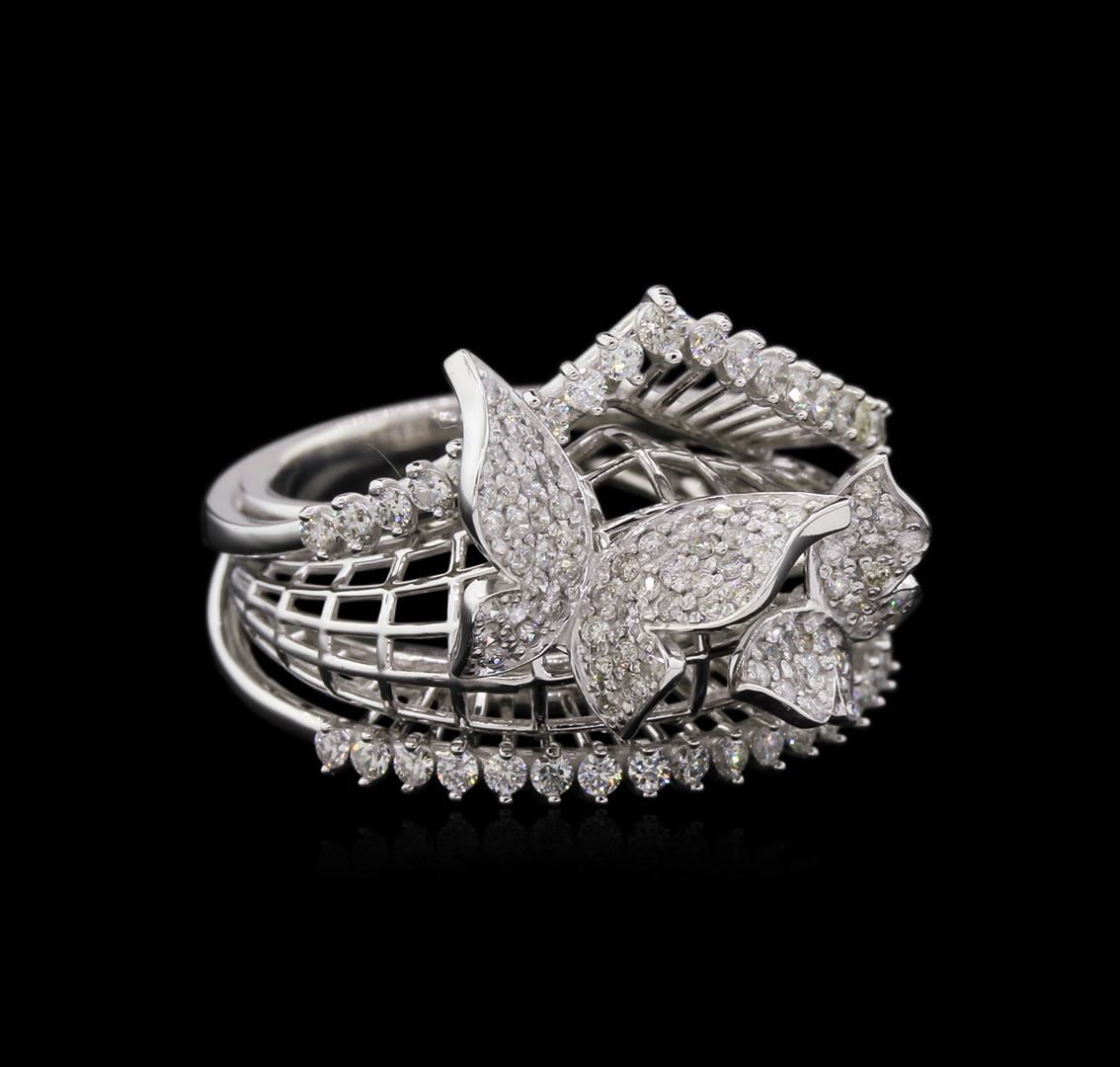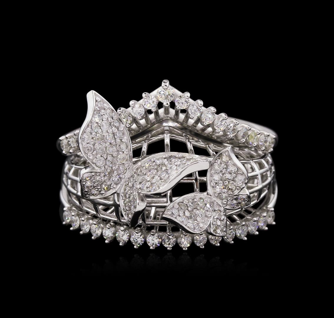 One electronically tested 14KT white gold lady's combination cast & assembled fashion ring with a tapered shank with a bright polish finish. The featured ring has a double butterfly motif and a shank measuring 4.5 millimeters in width. Identified with markings of "585". Condition is new, good workmanship. Containing: Thirty-Six prong set round brilliant cut diamonds, measuring 1.50 - 1.45 x 0.96mm (depth est.) approximate total weight of 36 Stones = 0.46ct. Graded in the setting. Clarity: VS-2 to SI-2. Color: G - Good Seventy-Four pave' set round brilliant cut diamonds, measuring 1.20 - 1.10 x 0.75mm (depth est.) approximate total weight of 74 Stones = 0.45ct. Graded in the setting. Clarity: SI-2 to I-1. Color: H - I. Cut Good. Total Weight of Diamonds 0.91ct. Total Weight of Ring 9.80gm. GAS Appraised at $5,020.00.