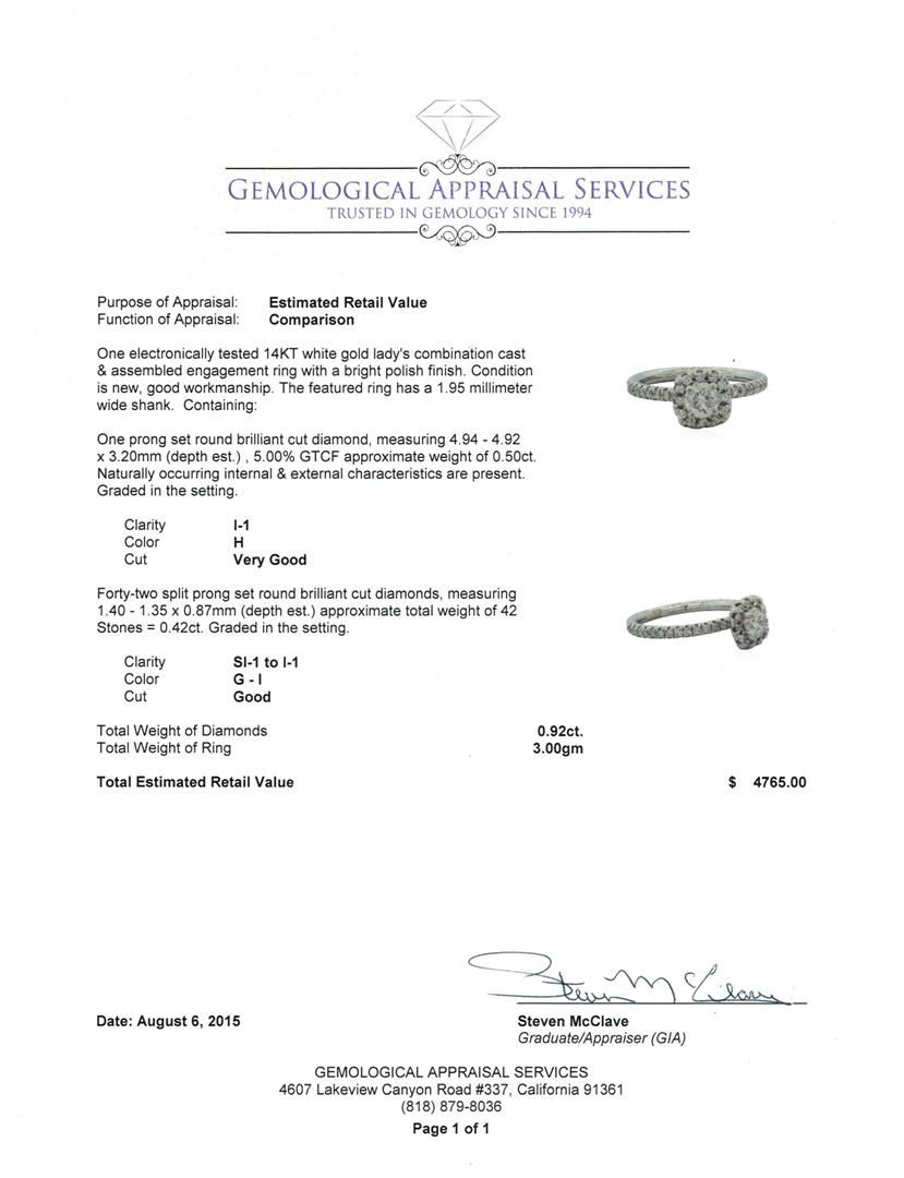 One electronically tested 14KT white gold lady's combination cast & assembled engagement ring with a bright polish finish. The featured ring has a 1.95 millimeter wide shank. Condition is new, good workmanship. Containing: One prong set round brilliant cut diamond, measuring 4.94 - 4.92 x 3.20mm (depth est.) , 5.00.%. GTCF approximate weight of 0.50ct. Naturally occurring internal & external characteristics are present. Graded in the setting. Clarity: I-1. Color: Very Good Forty-Two split prong set round brilliant cut diamonds, measuring 1.40 - 1.35 x 0.87mm (depth est.) approximate. Total Weight of 42 Stones = 0.42ct. Graded in the setting. Clarity: SI-1 to I-1. Color: G - I. Cut Good. Total Weight of Diamonds 0.92ct. Total Weight of Ring 3.00gm. GAS Appraised.