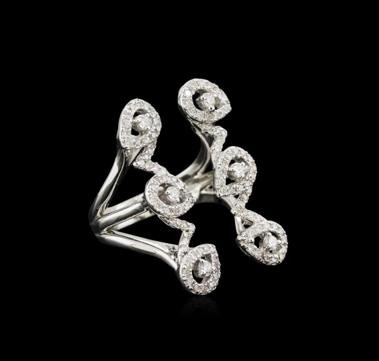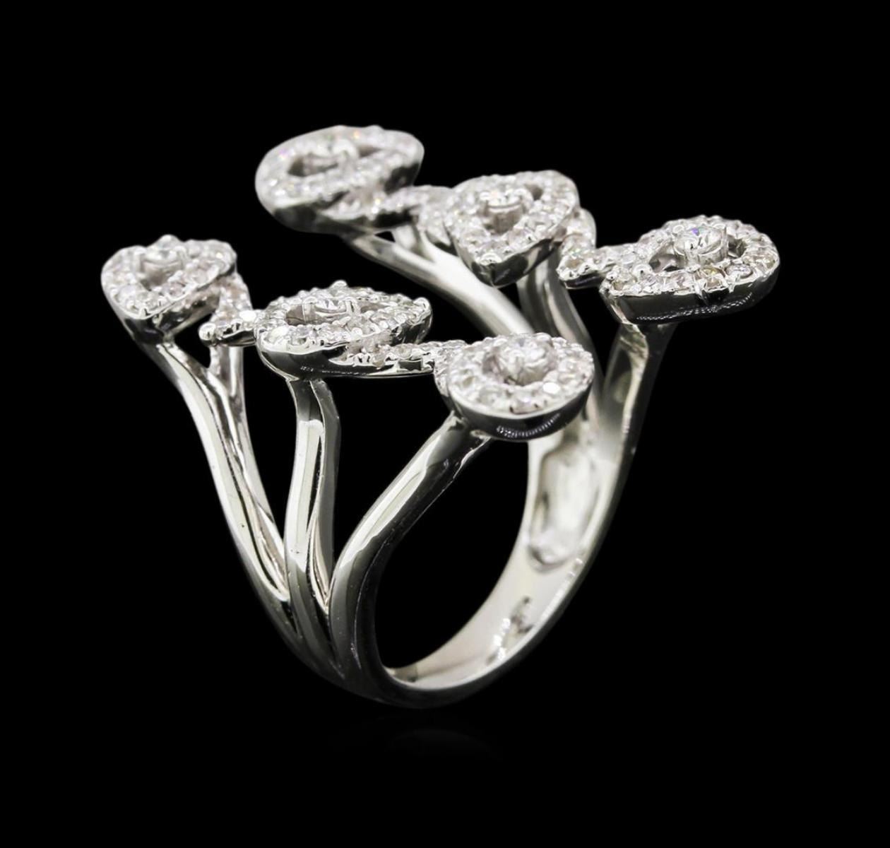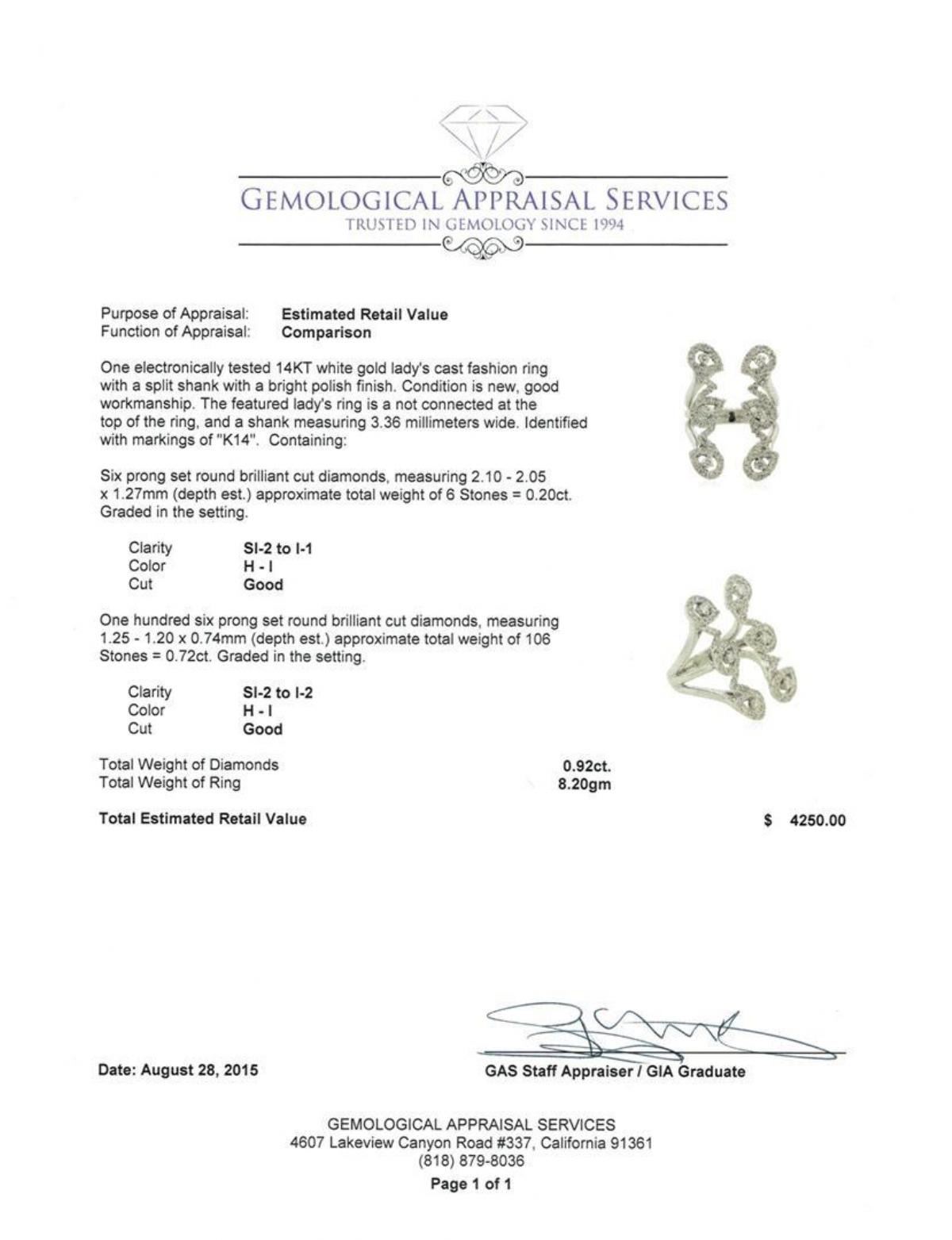 One electronically tested 14KT white gold lady's cast fashion ring with a split shank with a bright polish finish. The featured lady's ring is a not connected at the top of the ring, and a shank measuring 3.36 millimeters wide. Identified with markings of "K14". Condition is new, good workmanship. Containing: Six prong set round brilliant cut diamonds, measuring 2.10 - 2.05 x 1.27mm (depth est.) approximate total weight of 6 Stones = 0.20ct. Graded in the setting. Clarity: SI-2 to I-1. Color: H - I. Cut Good One Hundred Six prong set round brilliant cut diamonds, measuring 1.25 - 1.20 x 0.74mm (depth est.) approximate total weight of 106 Stones = 0.72ct. Graded in the setting. Clarity: SI-2 to I-2. Color: H - I. Cut Good. Total Weight of Diamonds 0.92ct. Total Weight of Ring 8.20gm. GAS Appraised.