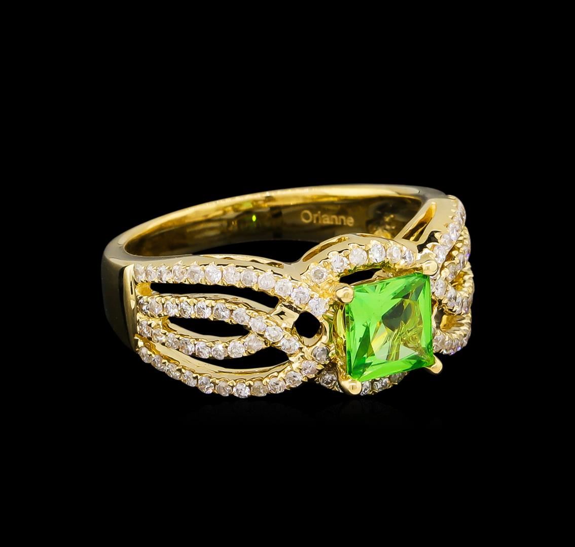 One electronically tested 14KT yellow gold lady's cast fashion ring with a bright polish finish. The featured lady's ring has a four row overlapping bypass motif and a shank measuring 3.18 millimeters wide. Trademark is Orianne. Identified with markings of "14K". Condition is new, good workmanship. Containing: One prong set princess modified brilliant cut natural tsavorite garnet, measuring 5.72 x 5.56 x 3.25mm, approximate weight of 0.92ct., clarity is eye clean, type II, medium, moderately strong, slightly yellowish green color, (GIA slyG 5/4), cut is very good. Transmitting light with no distortion, transparent. Colored gemstones are presumed to have been subjected to commonly used enhancement processes. Graded in the setting. Ninety-Six prong set round brilliant cut diamonds, measuring 1.25 - 1.20 x 0.78mm (depth est.) approximate total weight of 96 Stones = 0.68ct. Graded in the setting. Clarity: SI-2 to I-1. Color: H - I. Cut Good. Total Weight of Colored Stones 0.92ct. Total Weight of Diamonds 0.68ct. Total Weight of Ring 5.70gm. GAS Appraised at $5,060.00.