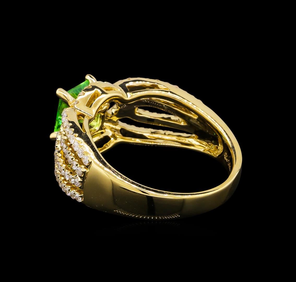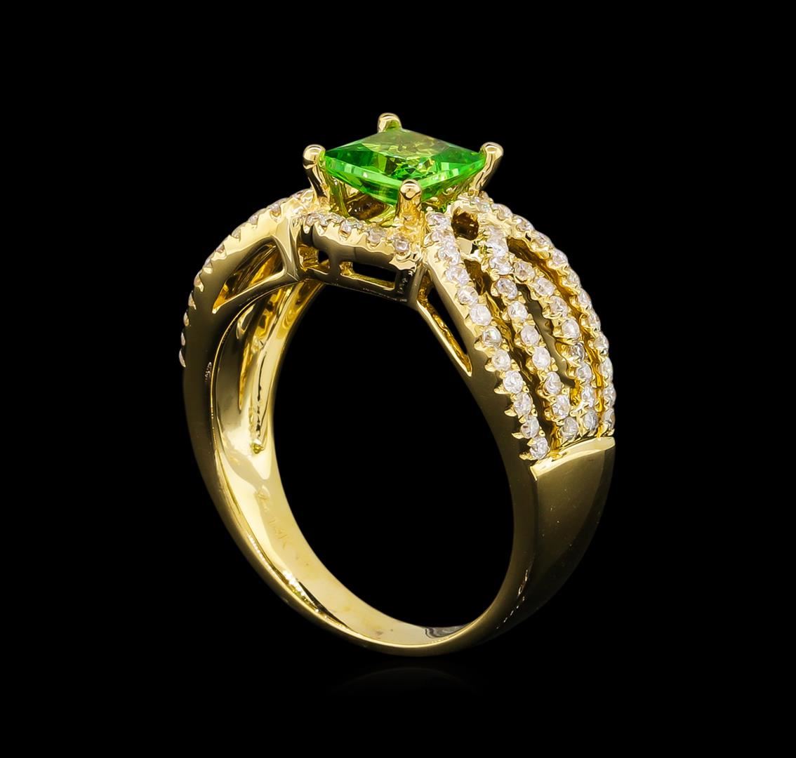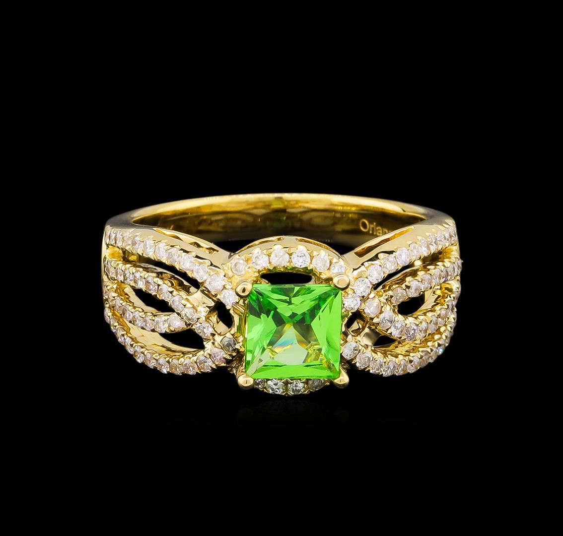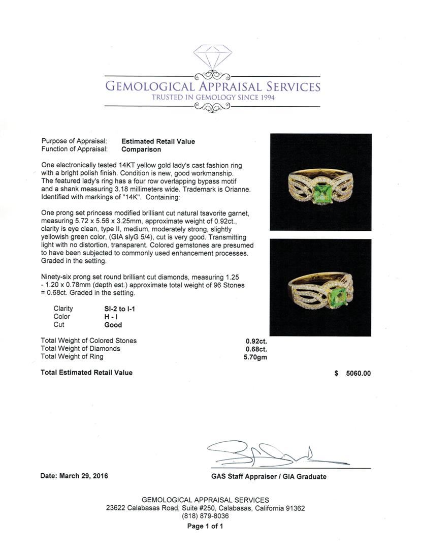 One electronically tested 14KT yellow gold lady's cast fashion ring with a bright polish finish. The featured lady's ring has a four row overlapping bypass motif and a shank measuring 3.18 millimeters wide. Trademark is Orianne. Identified with markings of "14K". Condition is new, good workmanship. Containing: One prong set princess modified brilliant cut natural tsavorite garnet, measuring 5.72 x 5.56 x 3.25mm, approximate weight of 0.92ct., clarity is eye clean, type II, medium, moderately strong, slightly yellowish green color, (GIA slyG 5/4), cut is very good. Transmitting light with no distortion, transparent. Colored gemstones are presumed to have been subjected to commonly used enhancement processes. Graded in the setting. Ninety-Six prong set round brilliant cut diamonds, measuring 1.25 - 1.20 x 0.78mm (depth est.) approximate total weight of 96 Stones = 0.68ct. Graded in the setting. Clarity: SI-2 to I-1. Color: H - I. Cut Good. Total Weight of Colored Stones 0.92ct. Total Weight of Diamonds 0.68ct. Total Weight of Ring 5.70gm. GAS Appraised.