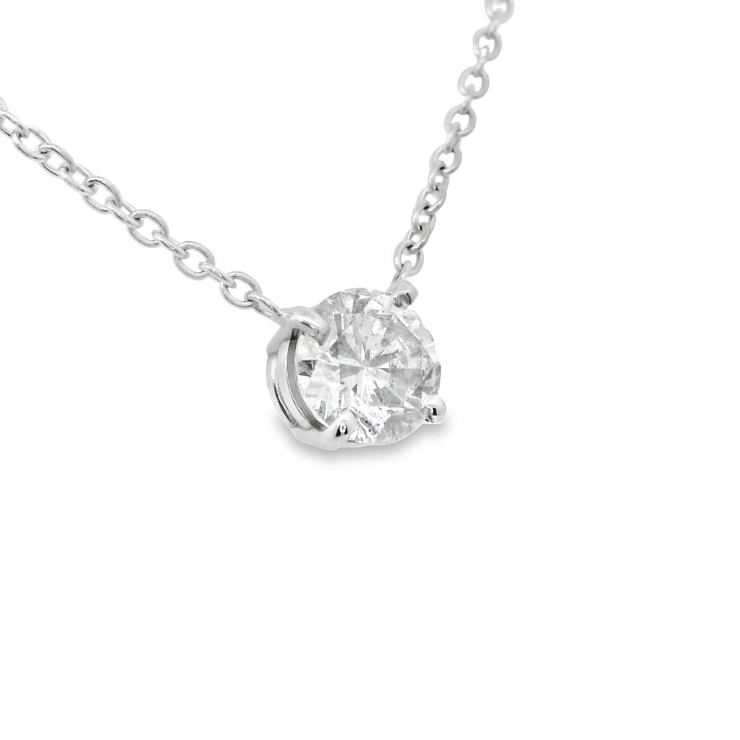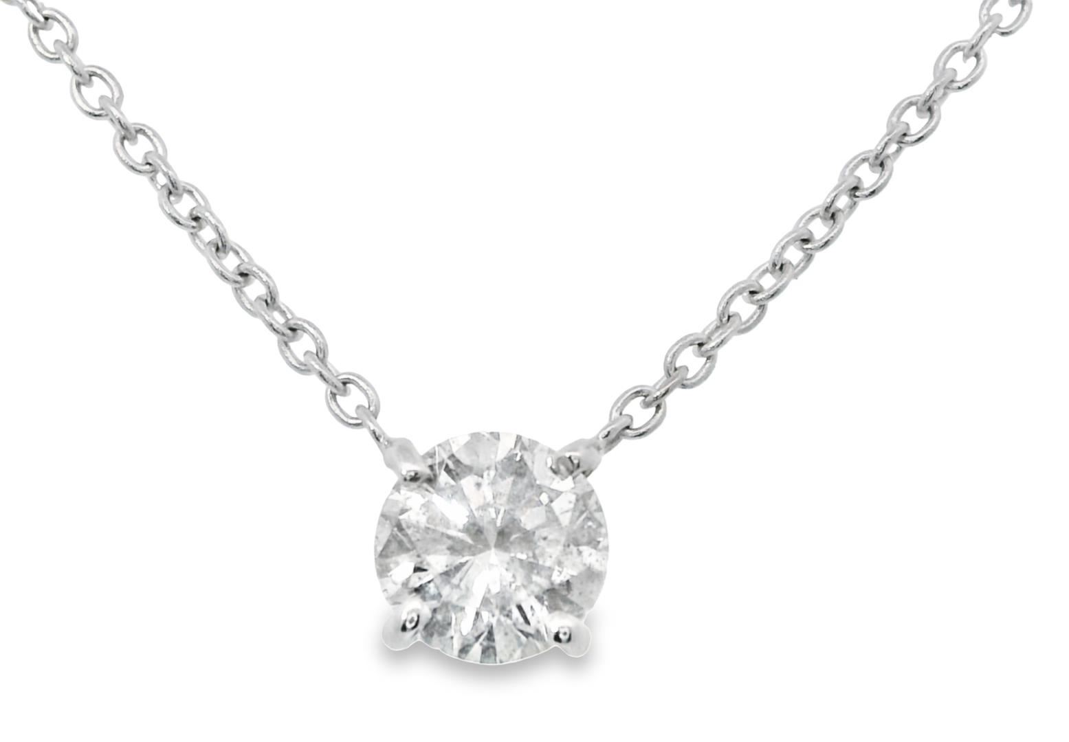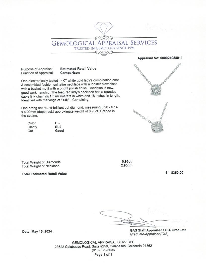 This elegant solitaire necklace showcases a brilliant 0.93ct round cut diamond with SI-2 clarity, set in 14KT white gold. Perfect for adding a touch of timeless sophistication, shell look radiant in this piece! One electronically tested 14k white gold lady's combination cast & assembled fashion solitaire necklace with a lobster claw clasp with a basket motif with a bright polish finish. Condition is new, good workmanship. The featured lady's necklace has a rounded cable link chain @ 1.3 millimeters in width and 18 inches in length. Identified with markings of 14K. Containing: One prong set round brilliant cut diamond, measuring 6.20 - 6.14 x 4.00mm (depth est.) approximate weight of 0.93ct. Graded in the setting. Color H-I Clarity SI-2 Cut Good Total Weight of Diamonds 0.93ct. Total Weight of Necklace 2.90gm Total Estimated Retail Value $8350.00 Appraisal No: 000024088011