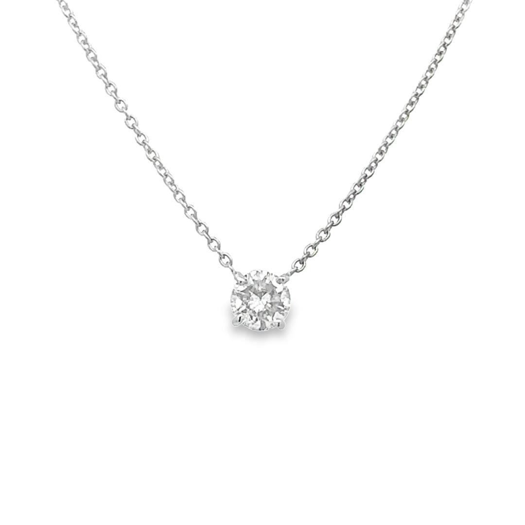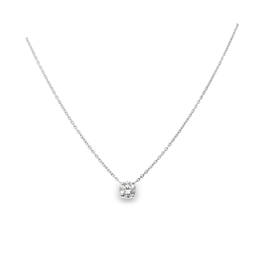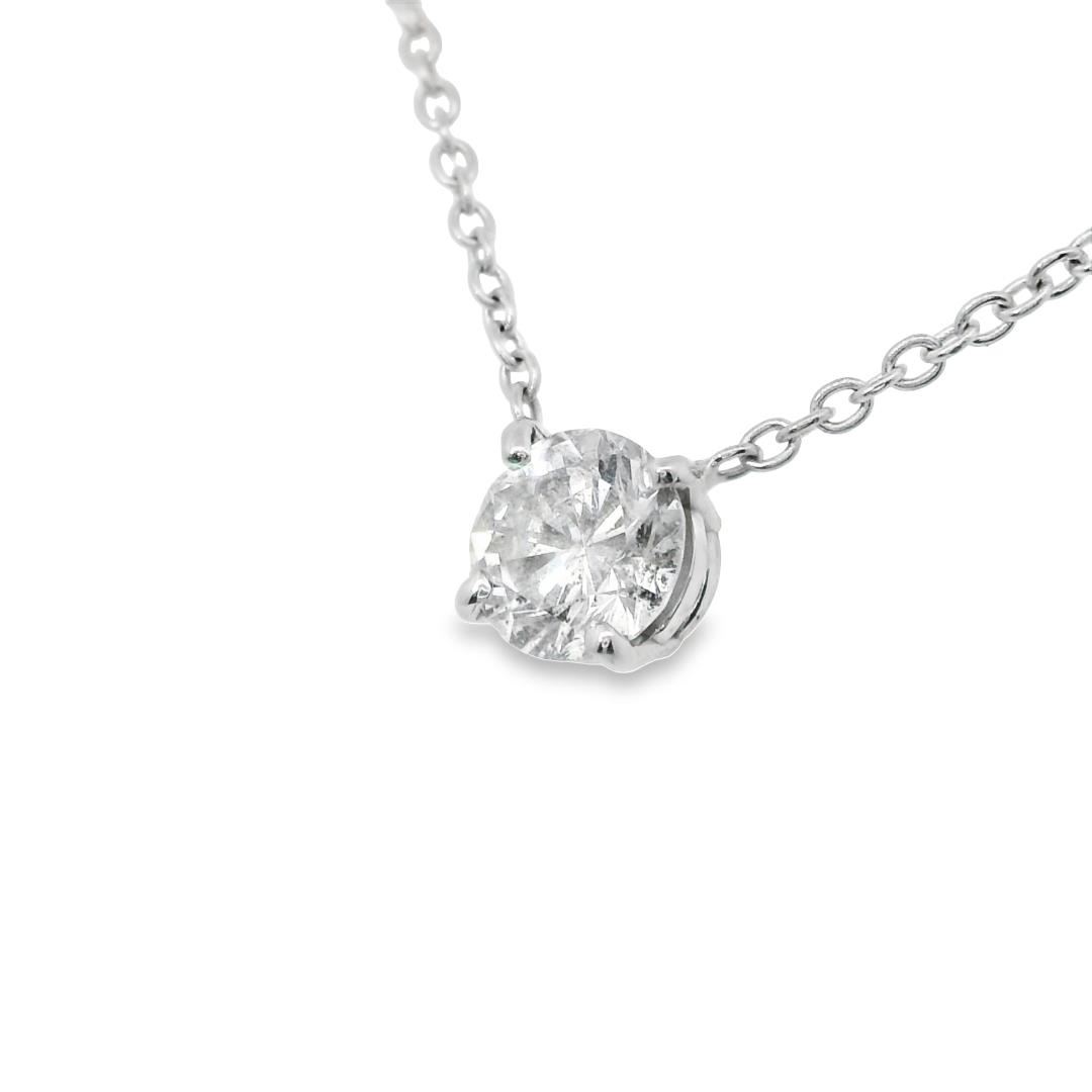 This elegant solitaire necklace showcases a brilliant 0.93ct round cut diamond with SI-2 clarity, set in 14KT white gold. Perfect for adding a touch of timeless sophistication, shell look radiant in this piece! One electronically tested 14k white gold lady's combination cast & assembled fashion solitaire necklace with a lobster claw clasp with a basket motif with a bright polish finish. Condition is new, good workmanship. The featured lady's necklace has a rounded cable link chain @ 1.3 millimeters in width and 18 inches in length. Identified with markings of 14K. Containing: One prong set round brilliant cut diamond, measuring 6.20 - 6.14 x 4.00mm (depth est.) approximate weight of 0.93ct. Graded in the setting. Color H-I Clarity SI-2 Cut Good Total Weight of Diamonds 0.93ct. Total Weight of Necklace 2.90gm Total Estimated Retail Value $8350.00 Appraisal No: 000024088011