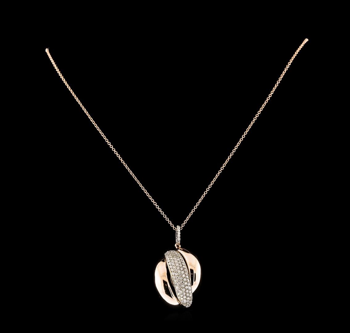 One electronically tested 14KT rose and white gold lady's combination cast & assembled fashion pendant & chain 18.0' long, 1.3mm round cable link with a lobster claw clasp with a bright polish finish. Identified with markings of '14K'. Condition is new, good workmanship. Containing: Sixty-Three prong set round brilliant cut diamonds, measuring 1.40 - 1.35 x 0.86mm (depth est.) approximate total weight of 63 Stones = 0.63ct. Graded in the setting. Clarity SI-1 to SI-2. Color: H - I Cut Good Forty prong set round brilliant cut diamonds, measuring 1.30 - 1.20 x 0.78mm (depth est.) approximate total weight of 40 Stones = 0.30ct. Graded in the setting. Clarity SI-1 to SI-3. Color: H - I Cut Good. Total Weight of Diamonds 0.93ct.. Total Weight of Pendant & Chain 7.90gm. GAS Appraised at $4,165.00.