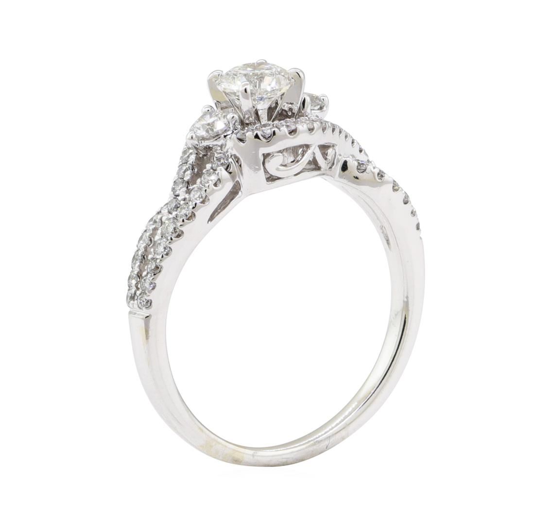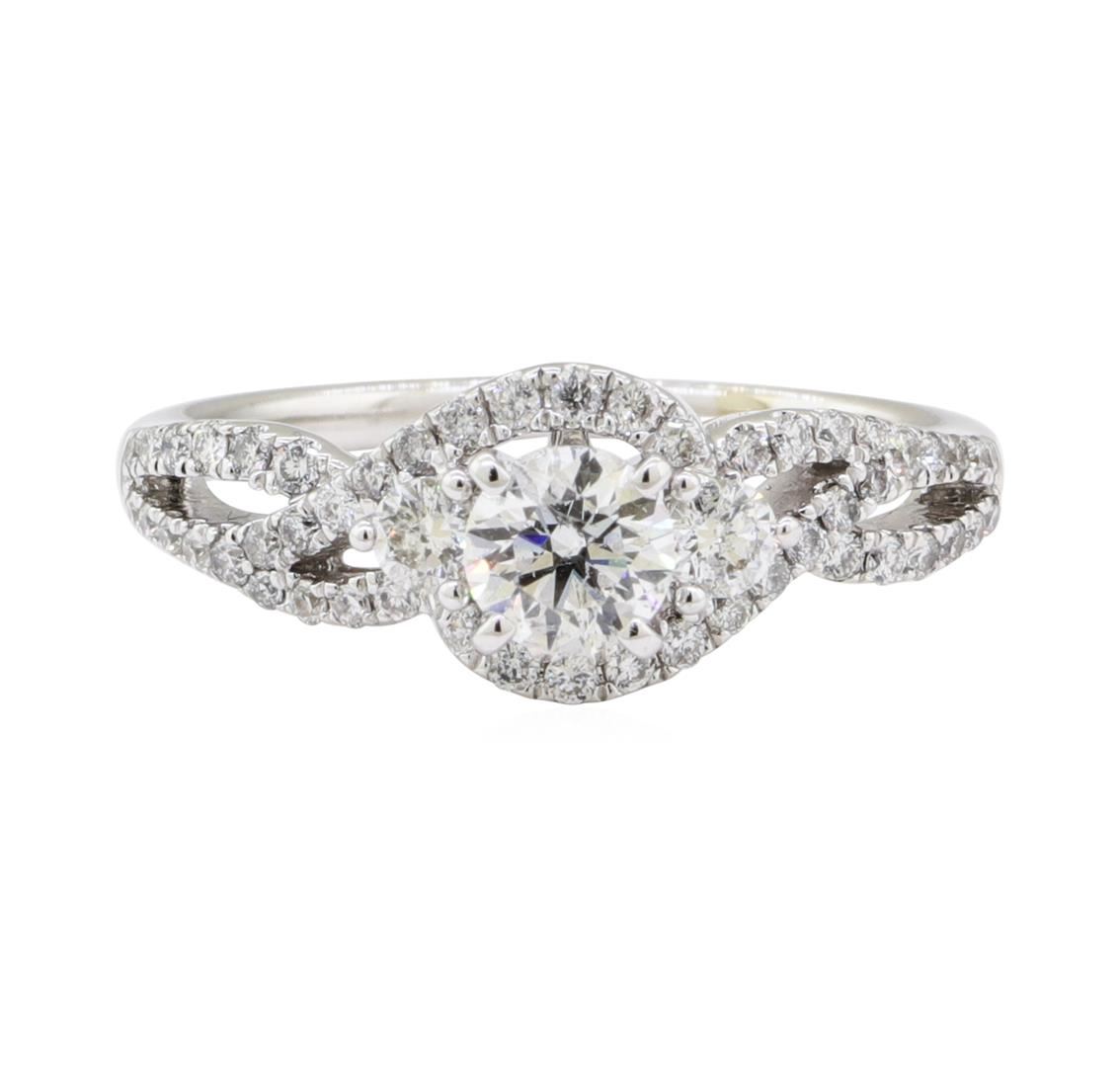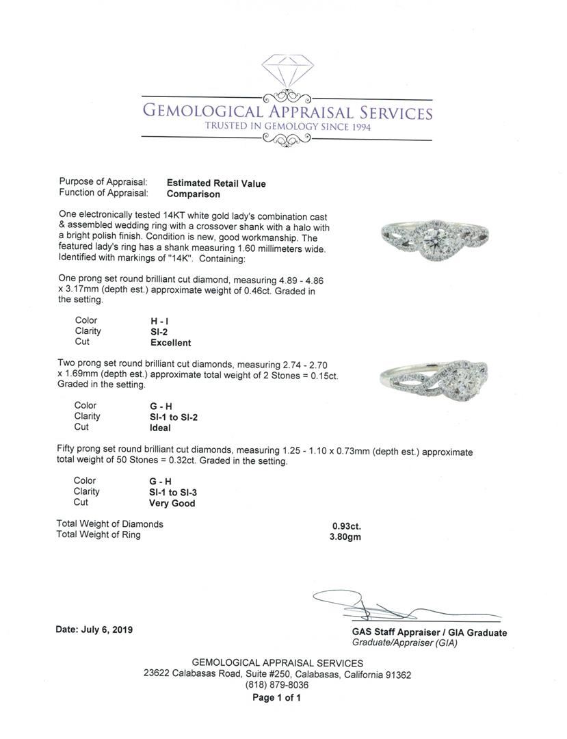 One electronically tested 14KT white gold lady's combination cast & assembled wedding ring with a crossover shank with a halo with a bright polish finish. The featured lady's ring has a shank measuring 1.60 millimeters wide. Identified with markings of '14K'. Condition is new, good workmanship. Containing: One prong set round brilliant cut diamond, measuring 4.89 - 4.86 x 3.17mm (depth est.) approximate weight of 0.46ct. Graded in the setting. Color H - I Clarity SI-2 Cut Excellent Two prong set round brilliant cut diamonds, measuring 2.74 - 2.70 x 1.69mm (depth est.) approximate total weight of 2 Stones = 0.15ct. Graded in the setting. Color G - H Clarity SI-1 to SI-2 Cut Ideal Fifty prong set round brilliant cut diamonds, measuring 1.25 - 1.10 x 0.73mm (depth est.) approximate total weight of 50 Stones = 0.32ct. Graded in the setting. Color G - H Clarity SI-1 to SI-3 Cut Very Good. Total Weight of Diamonds 0.93ct.. Total Weight of Ring 3.80gm GAS Appraised at $4330.00. GAS Appraised.