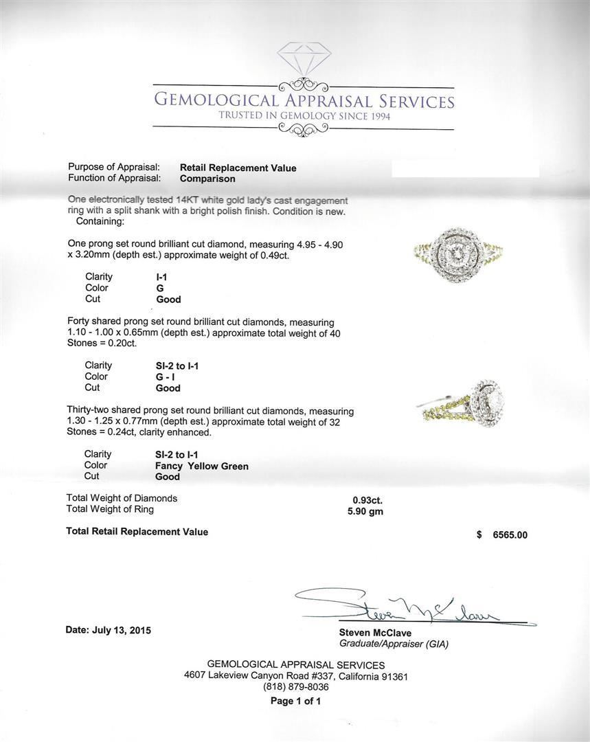 One electronically tested 14KT white gold lady's cast engagement ring with a split shank with a bright polish finish. Condition is new. Containing: One prong set round brilliant cut diamond, measuring 4.95 - 4.90 x 3.20mm (depth est.) approximate weight of 0.49ct. Clarity: I-1. Color: G. Cut: Good. Forty shared prong set round brilliant cut diamonds, measuring 1.10 - 1.00 x 0.65mm (depth est.) approximate total weight of 40 Stones = 0.20ct. Clarity: SI-2 to I-1. Color: G - I. Cut: Good. Thirty-two shared prong set round brilliant cut diamonds, measuring 1.30 - 1.25 x 0.77mm (depth est.) approximate total weight of 32 Stones = 0.24ct, clarity enhanced. Clarity: SI-2 to I-1. Color: Fancy Yellow Green. Cut: Good. Total Weight of Diamonds: 0.93ct. Total Weight of Ring: 5.90 gm. GAS Appraised.