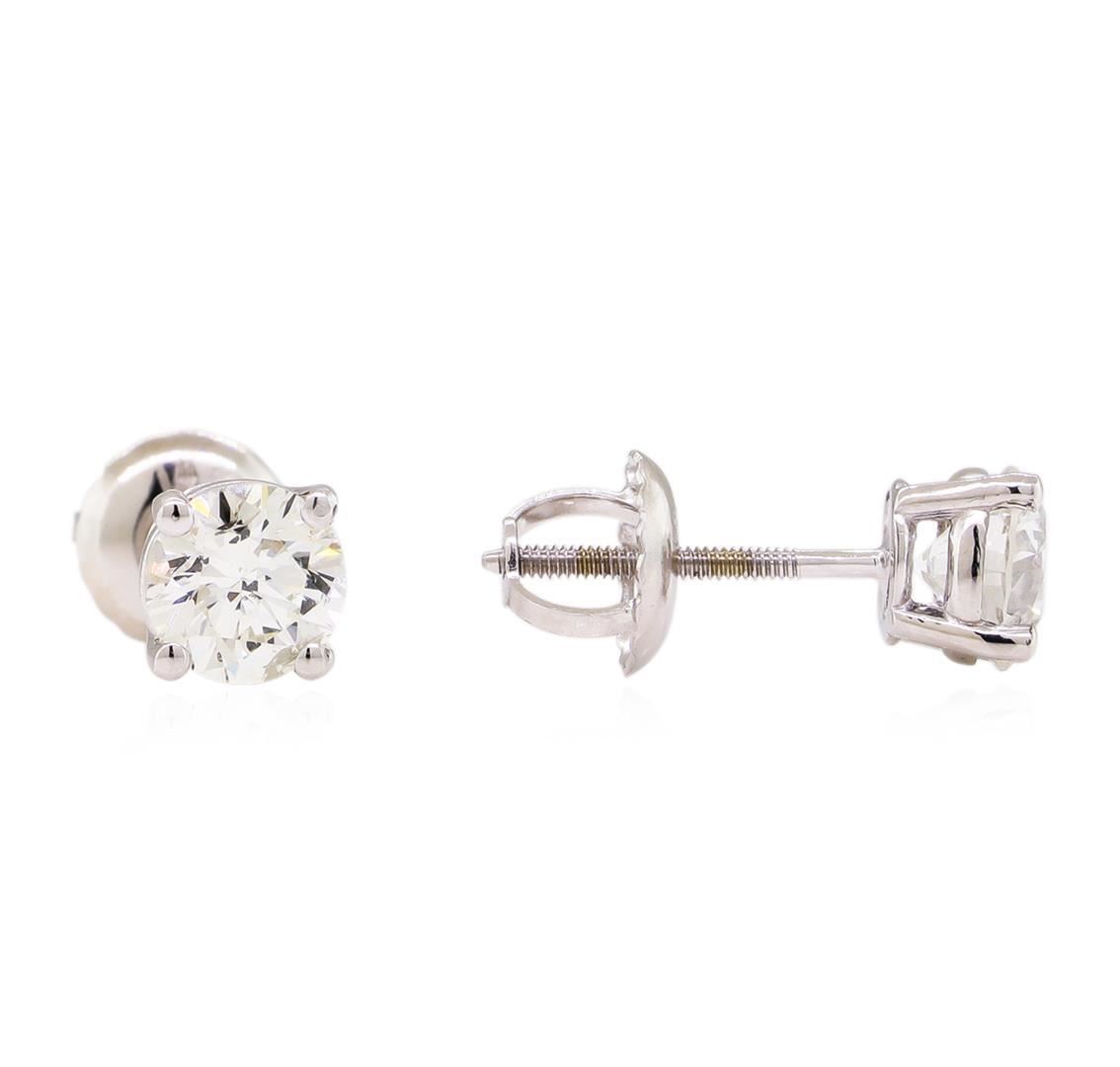 One pair electronically tested 14KT white gold lady's combination cast & assembled stud earrings with threaded posts and screw-on/screw-off backs with a bright polish finish. Identified with markings of "14K". Condition is new, good workmanship. Containing: Two prong set round brilliant cut diamonds, measuring 4.85 - 4.81 x 3.09mm (depth est.) , 5.00.%. GTCF approximate total weight of 2 Stones = 0.93ct. Graded in the setting. Clarity: SI-1 to SI-2. Color: H - I. Cut Very Good. Total Weight of Diamonds 0.93ct. Total Weight of Earrings 1.00gm. GAS Appraised.