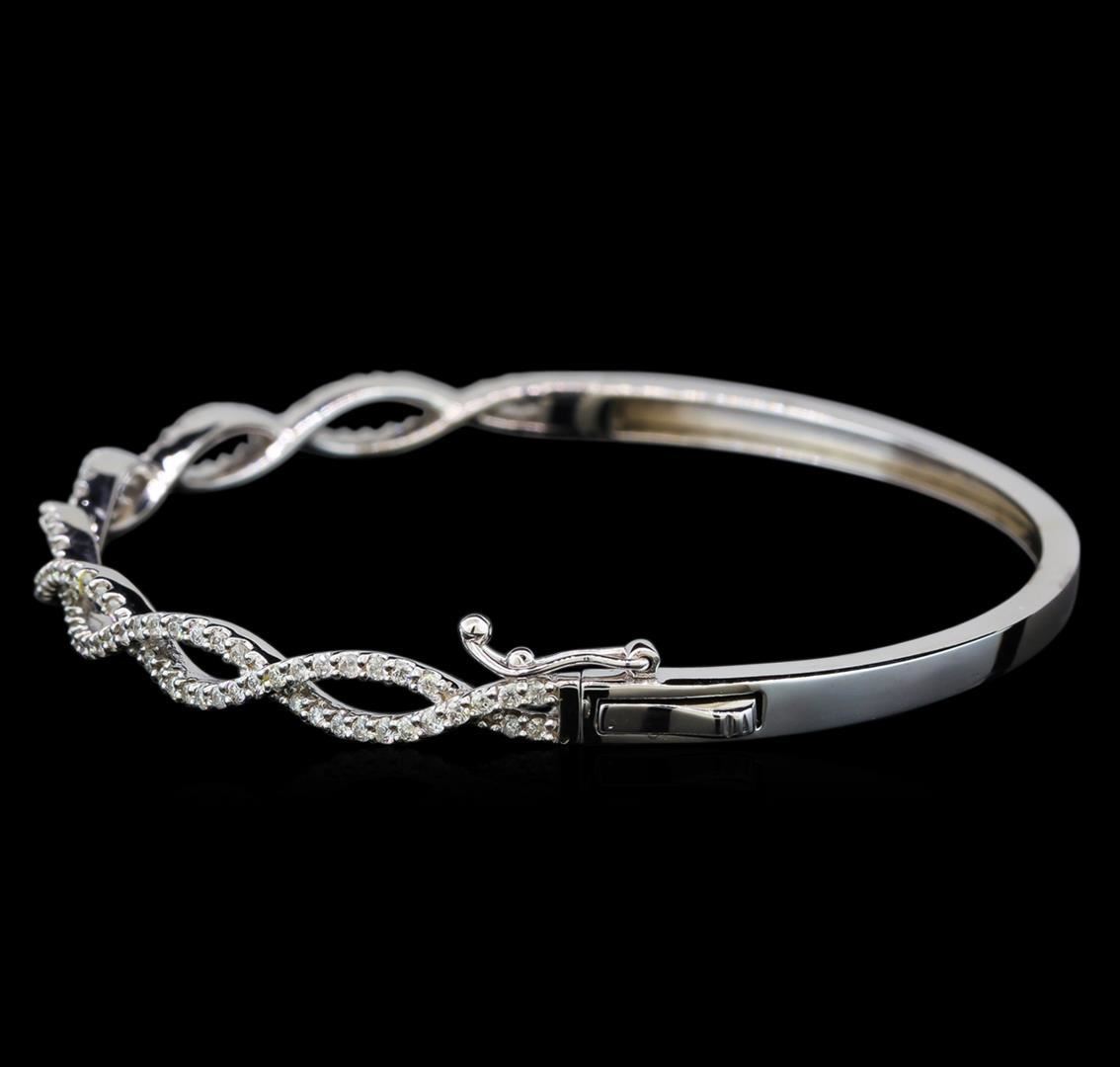 One electronically tested 14KT white gold lady's combination cast & assembled braided fashion bangle bracelet with a tongue clasp with foldover safety with a bright polish finish. The featured lady's bracelet measures approximately 7 inches in length. Identified with markings of 'K14'. Condition is new, good workmanship. Containing: One Hundred Twenty prong set round brilliant cut diamonds, measuring 1.30 - 1.25 x 0.79mm (depth est.) approximate total weight of 120 Stones = 0.94ct. Graded in the setting. Clarity SI-2 to I-2. Color: H - I Cut Good. Total Weight of Diamonds 0.94ct.. Total Weight of Bangle Bracelet 10.70gm. GAS Appraised.